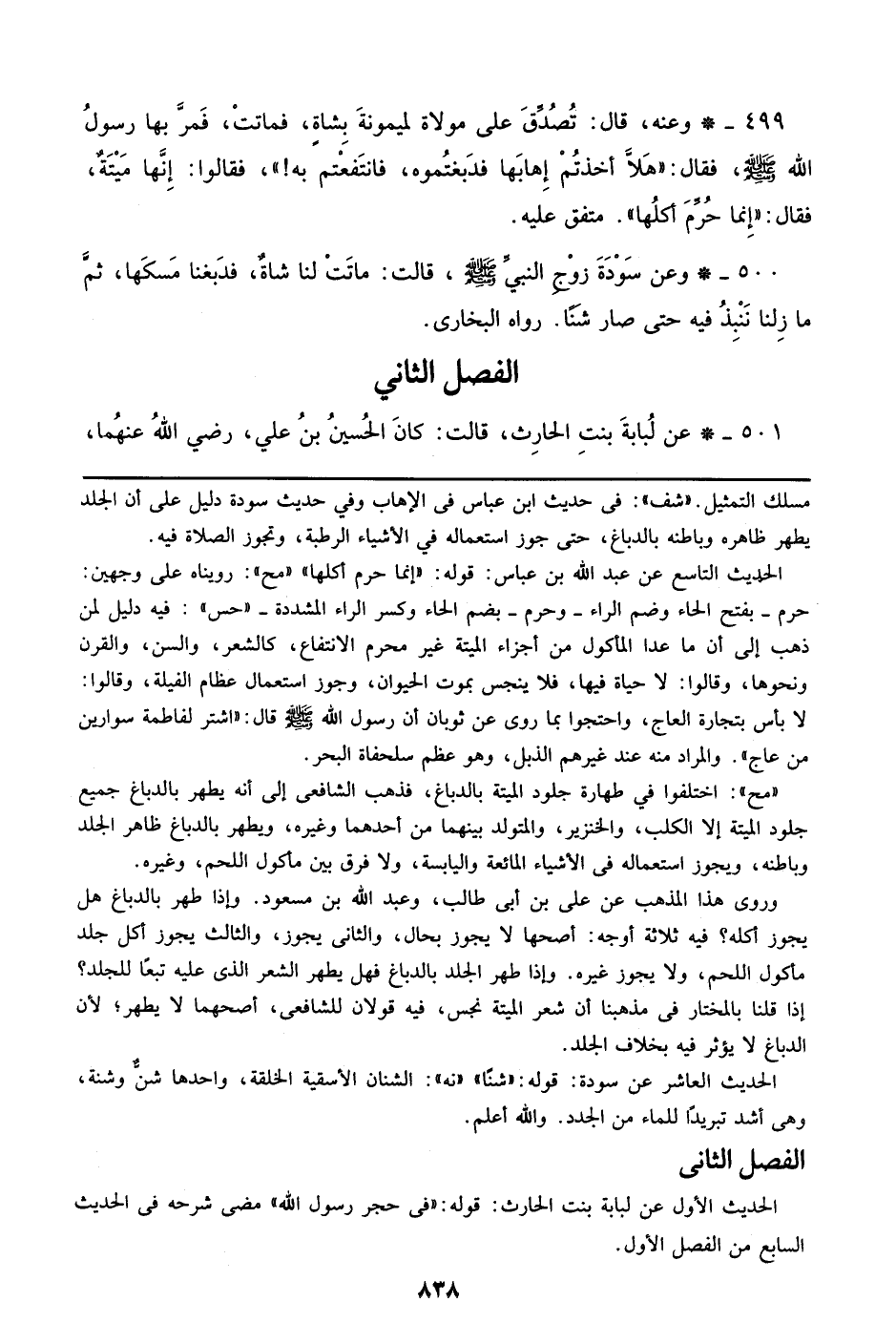500 - وعن سودة زود النبي صلى الله عليه وسلم، قالت: ماتت لنا شاة، فدبغنا مسكها، ثم مازلنا ننبذ فيه حتى صار شناً. رواه البخاري.