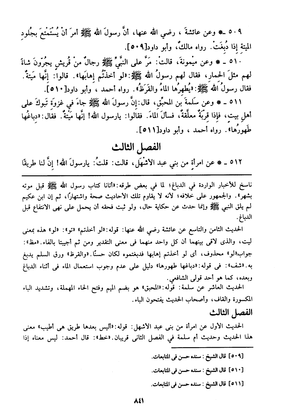 511 - وعن سلمة بن المحبق، قال: إن رسول الله صلى الله عليه وسلم جاء في غزوة تبوك علي أهل البيت، فإذا قربة معلقة، فسأل الماء. فقالوا: يا رسول الله! إنها ميتة. فقال: ((دباغها طهورها)). رواه أحمد، وأبو داود [511].