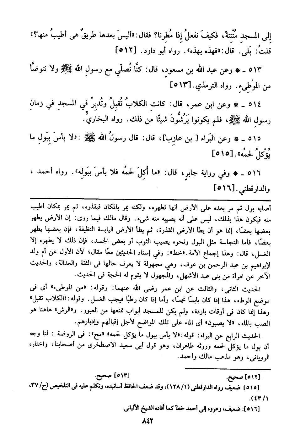 516 - وفي رواية جابر، قال: ((ما أكل لحمه فلا بأس ببوله)). رواه أحمد، والدارقطني. [516]