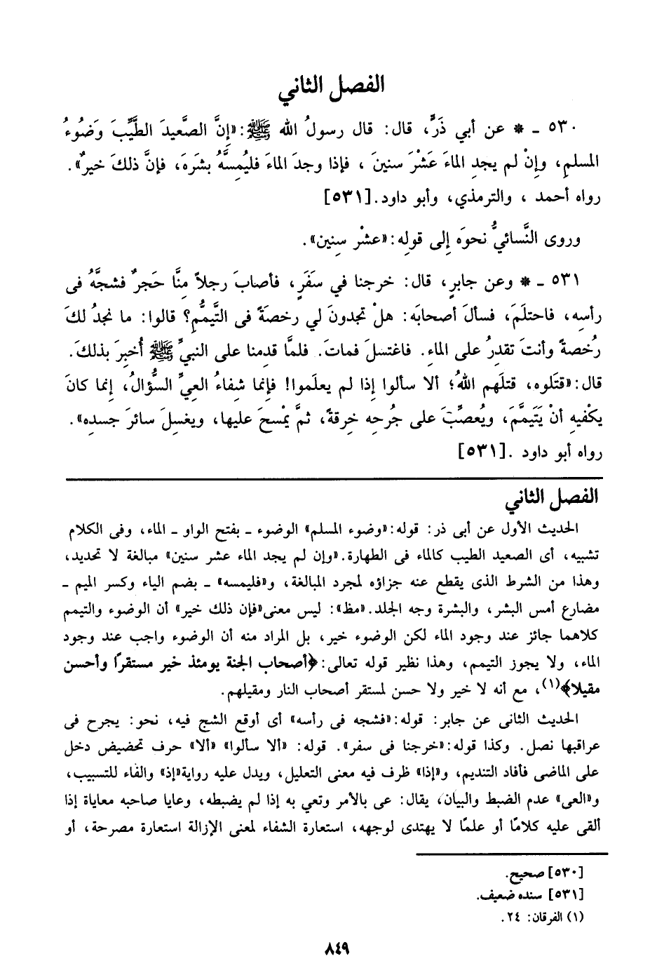 الحديث الأول عن أبي ذر: قوله: ((وضوء المسلم)) الوضوء- بفتح الواو- الماء، وفي الكلام تشبيه، أي الصعيد الطيب كالماء في الطهارة. ((وإن لم يجد الماء عشر سنين)) مبالغة لا تحديد، وهذا من الشرط الذي يقطع عنه جزاؤه لمجرد المبالغة، و ((فليمسه)) - بضم الياء وكسر الميم- مضارع أمس البشر، والبشرة وجه الجلد. ((مظ)): ليس معنى ((فإن ذلك خير)) أن الوضوء والتيمم كلاهما جائز عند وجود الماء لكن الوضوء خير، بل المراد منه أن الوضوء واجب عند وجود الماء، ولا يجوز التيمم، وهذا نظير قوله تعالي: {أصحاب الجنة يومئذ خير مستقراً وأحسن مقيلا}، مع أنه لا خير ولا حسن لمستقر أصحاب النار ومقيلهم.