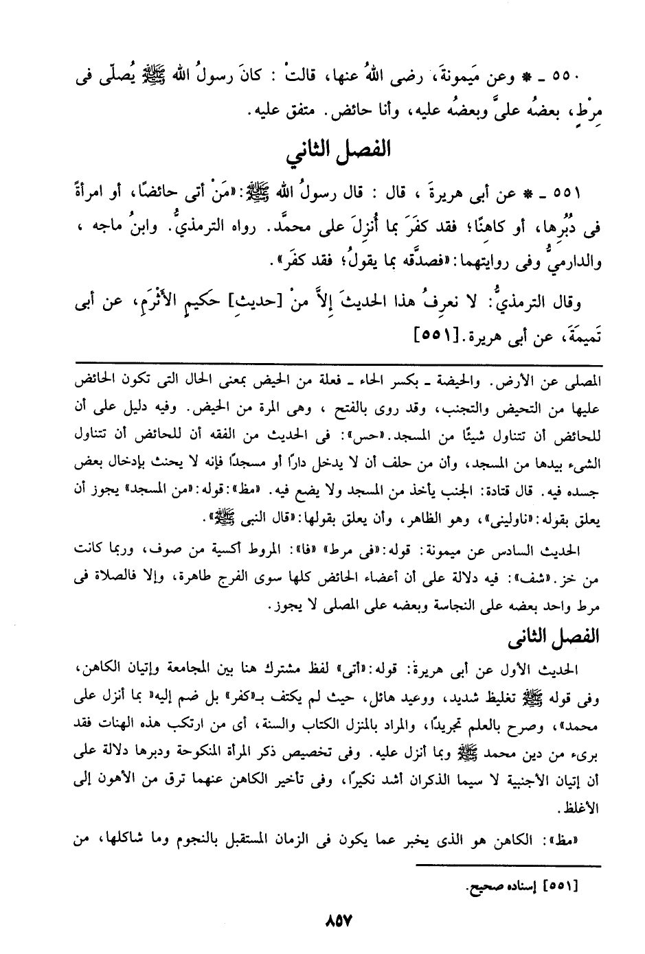 551 - عن أبي هريرة، قال: قال رسول الله صلى الله عليه وسلم: ((من أتى حائضاً، أو امرأة في دبرها، أو كاهناً؛ فقد كفر بما أنزل علي محمد. رواه الترمذي. وابن ماجه، والدارمي وفي روايتهما: ((فصدقه بما يقول؛ فقد كفر)).