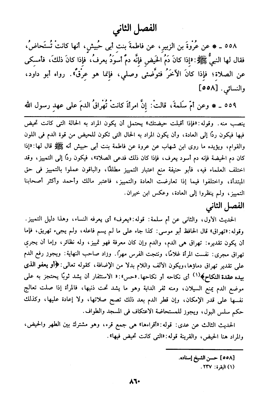 558 - عن عروة بن الزبير، عن فاطمة بنت أبي حبيش، أنها كانت تستحاض، فقال لها النبي صلى الله عليه وسلم: ((إذا كان دم الحيض فإنه دم أسود يعرف، فإذا كان ذلك، فأمسكي عن الصلاة؛ فإذا كان الآخر فتوضئي وصلي، فإنما هو عرق)). رواه أبو داود، والنسائي. [558]