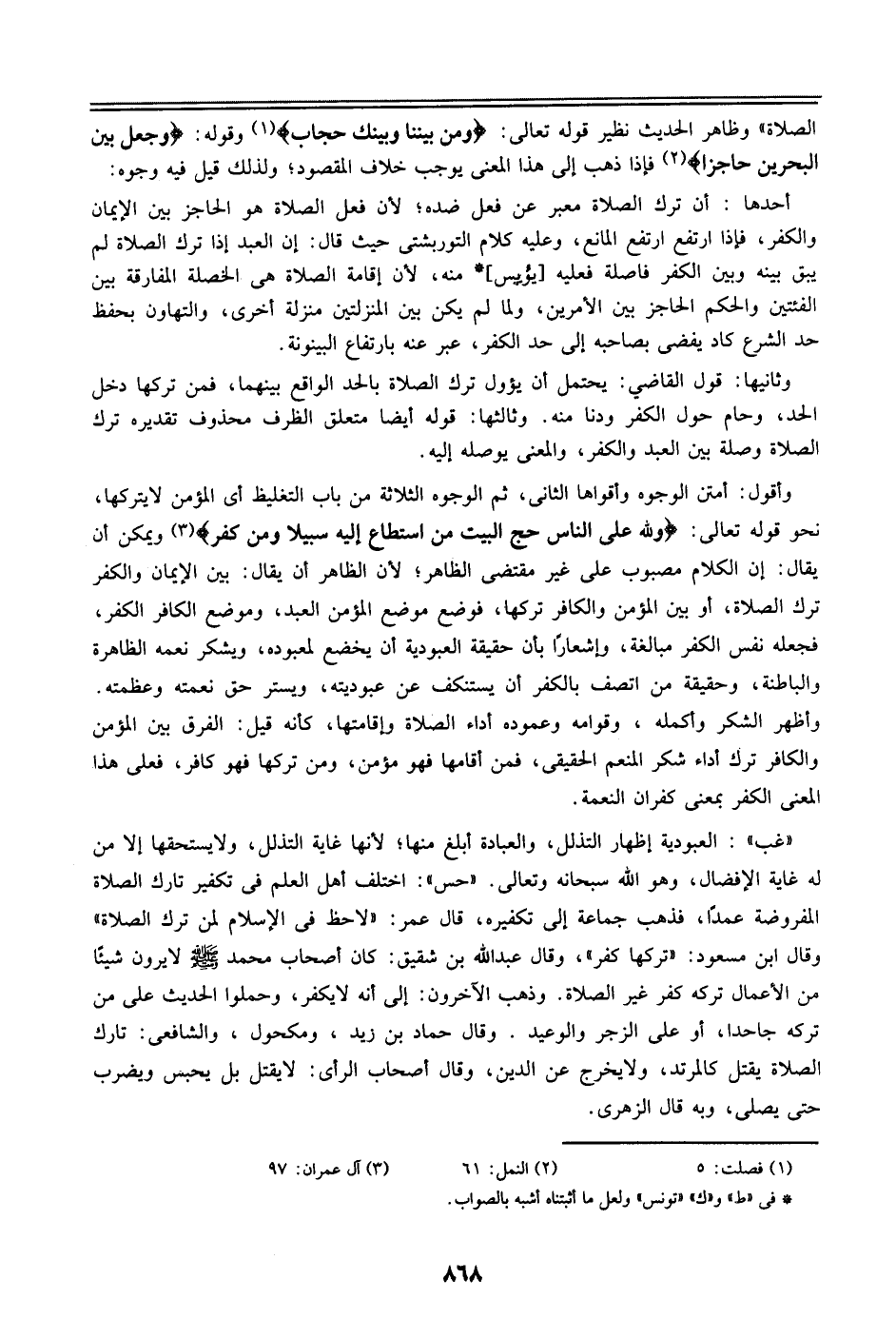 ((غب)): العبودية إظهار التذلل، والعبادة أبلغ منها؛ لأنها غاية التذلل، ولا يستحقها غلا من له غاية الإفضال، وهو الله سبحانه وتعالي. ((حس)): اختلف أهل العلم في تكفير تارك الصلاة المفروضة عمداً، فذهب جماعة إلي تكفيره، قال عمر: ((لا حظ في الإسلام لمن ترك الصلاة)) وقال ابن مسعود: ((تركها كفر))، وقال عبد الله بن شقيق: كان أصحاب محمد صلى الله عليه وسلم لا يرون شيئاً من الأعمال تركه كفر غير الصلاة. وذهب الآخرون: إلي أنه لا يكفر، وحملوا الحديث علي من تركه جاحداً، أو علي الزجر والوعيد. وقال حماد بن زيد، ومكحول، والشافعي: تارك الصلاة يقتل كالمرتد، ولا يخرج عن الدين، وقال أصحاب الرأي: لا يقتل بل يحبس ويضرب حتى يصلي، وبه قال الزهري.