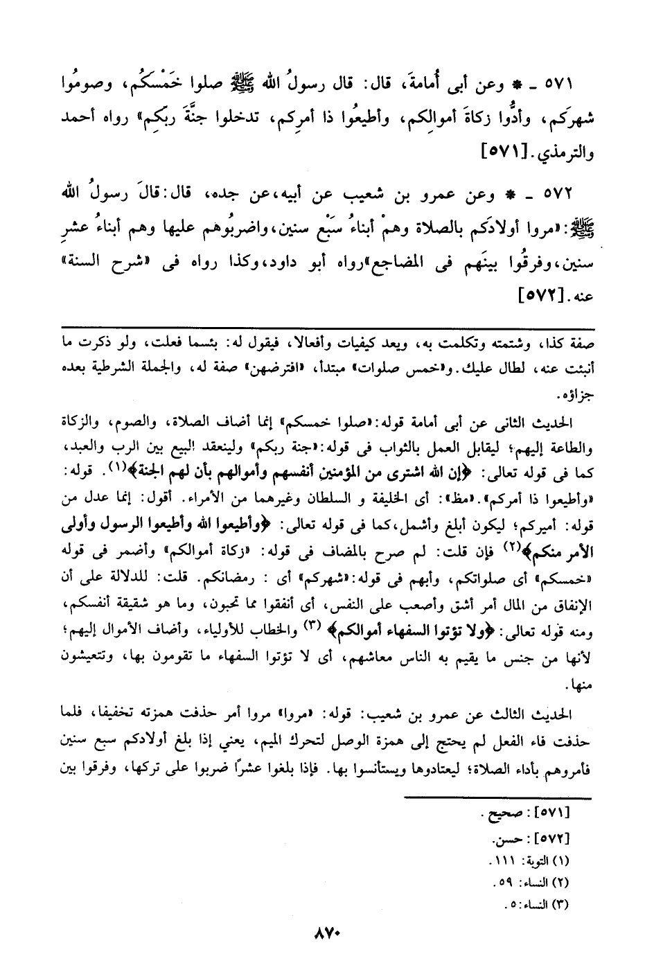 572 - وعن عمرو بن شعيب عن أبيه، عن جده، قال: قال رسول الله صلى الله عليه وسلم: ((مروا أولادكم بالصلاة وهم أبناء سبع سنين، واضربوهم عليها وهم أبناء عشر سنين، وفرقوا بينهم في المضاجع)) رواه أبو داود، وكذا رواه في ((شرح السنة)) عنه. [572]