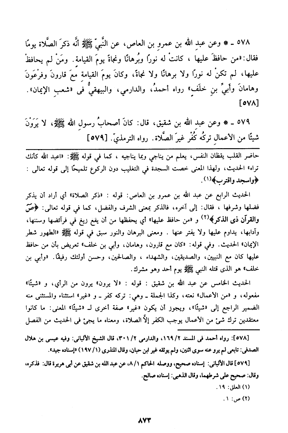 579 - وعن عبد الله بن شقيق، قال: كان أصحاب رسول الله صلى الله عليه وسلم، لا يرون شيئاً من الأعمال تركه كفر غير الصلاة. رواه الترمذي. [579]