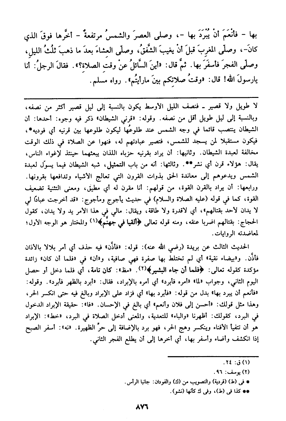 لا طويل ولا قصير- فنصف الليل الأوسط يكون بالنسبة إلي ليل قصير أكثر من نصفه، وبالنسبة إلي ليل طويل أقل من نصفه. وقوله: ((قرني الشيطان)) ذكر فيه وجوه: أحدها: أن الشيطان ينتصب قائماً في وجه الشمس عند طلوعها ليكون طلوعها بين قرنيه أي فوديه، فيكون مستقبلاً لمن يسجد للشمس، فتصير عبادتهم له، فنهوا عن الصلاة في ذلك الوقت مخالفة لعبدة الشيطان. وثإنيها: أن يراد بقرنيه حزباه اللذان يبعثهما حينئذ لإغواء الناس، يقال: هؤلاء قرن أي نشر. وثالثها: أنه من باب التمثيل، شبه الشيطان فيما يسول لعبدة الشمس ويدعوهم إلي معاندة الحق بذوات القرون التي تعالج الأشياء وتدافعها بقرونها. ورابعها: أن يراد بالقرن القوة، من قولهم: أنا مقرن له أي مطيع له، ومعنى التثنية تضعيف القوة، كما في قوله (عليه الصلاة والسلام) في حديث يأجوج ومأجوج: ((قد أخرجت عباداً لي لا يدان لأحد بقتالهم))، أي لا قدرة ولا طاقة، ويقال: ما لي في هذا الأمر يد ولا يدان، كقول الحجاج: بقتالهم اضربا عنقه، ومنه قوله تعالي {ألقيا في جهنم} والمختار هو الوجه الأول؛ لمعاضدته الروايات.