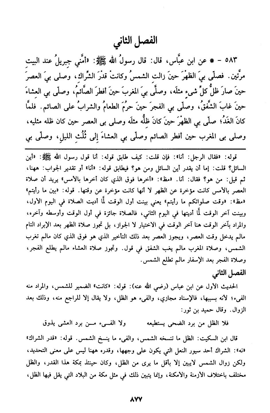 583 - عن ابن عباس، قال: قال رسول الله صلى الله عليه وسلم: ((أمني جبريل عند البيت مرتين. فصلي بي الظهر حين زالت الشمس وكانت قدر الشراك، وصلي بي العصر حين صار ظل كل شيء مثله، وصلي بي المغرب حين أفطر الصائم، وصلي بي العشاء حين غاب الشفق، وصلي بي الفجر حين حرم الطعام والشراب علي الصائم. فلما كان الغد؛ صلي بي الظهر حين كان ظله مثله وصلي بي العصر حين كان ظله مثليه، وصلي بي المغرب حين أفطر الصائم وصلي بي العشاء إلي ثلث الليل، وصلي بي