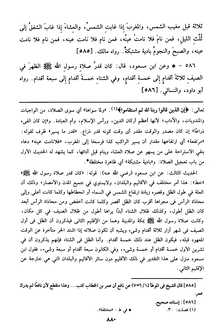 586 - وعن ابن مسعود، قال: كان قدر صلاة رسول الله صلى الله عليه وسلم الظهر في الصيف ثلاثة أقدام إلي خمسة أقدام، وفي الشتاء خمسة أقدام إلي سبعة أقدام. رواه أبو داود، والنسائي. [586]