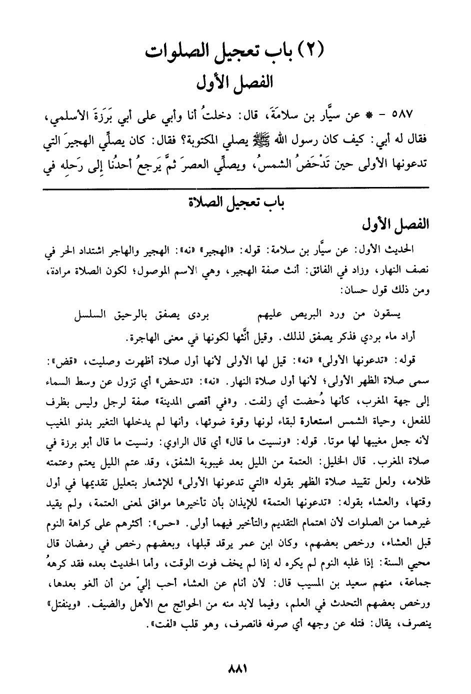 587 - عن سيار بن سلامة، قال: دخلت أنا وأبي علي أبي برزة الأسلمي، فقال له أبي: كيف كان رسول الله صلى الله عليه وسلم يصلي المكتوبة؟ فقال: كان يصلي الهجير التي تدعونها الأولي حين تدحض الشمس، ويصلي العصر ثم يرجع أحدنا إلي رحله في