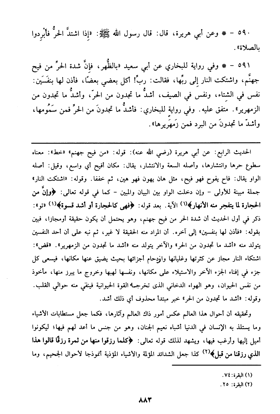 591 - وفي رواية للبخاري عن أبي سعيد ((بالظهر، فإن شدة الحر من فيح جهنم، واشتكت النار إلي ربها، فقالت: رب! أكل بعضي بعضاً، فأذن لها بنفسين: نفس في الشتاء، ونفس في الصيف، أشد ما تجدون من الحر، وأشد ما تجدون من الزمهرير)). متفق عليه. وفي رواية للبخاري: فأشد ما تجدون من الحر فمن سمومها، وأشد ما تجدون من البرد فمن زمهريرها)).