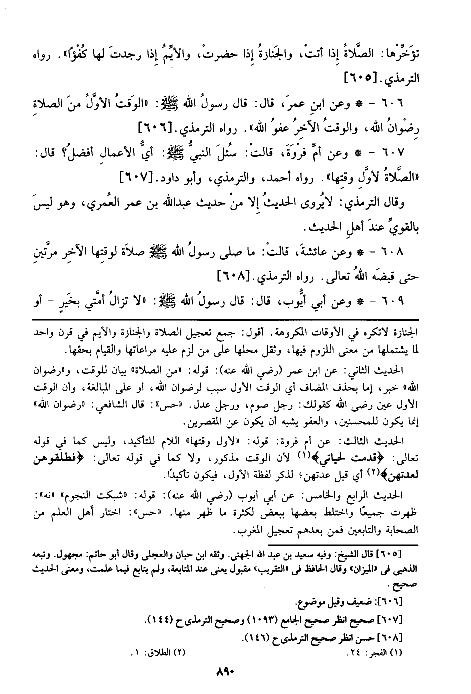 606 - وعن ابن عمر، قال: قال رسول الله صلى الله عليه وسلم: ((الوقت الأول من الصلاة رضوان الله، والوقت الآخر عفو الله)). رواه الترمذي. [606]