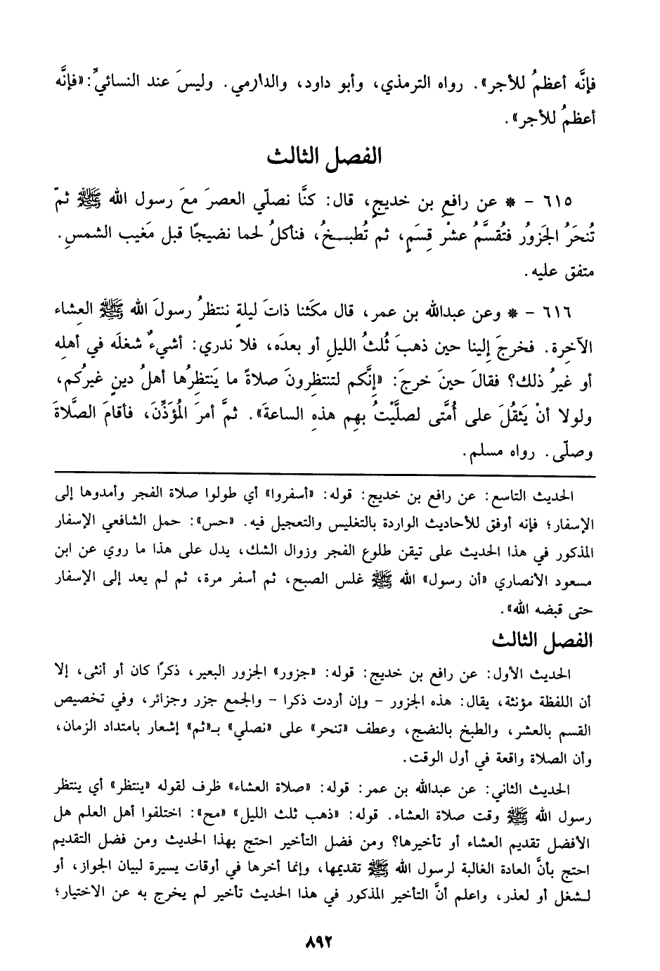 الحديث الأول: عن رافع بن خديج: قوله: ((جزور)) الجزور البعير، ذكراً كان أو أنثى، إلا أن اللفظة مؤنثة، يقال: هذه الجزور- وإن أردت ذكرا- والجمع جزر وجزائر، وفي تخصيص القسم بالعشر، والطبخ بالنضج، وعطف ((تنحر)) علي ((نصلي)) بـ ((ثم)) إشعار بامتداد الزمان، وأن الصلاة واقعة في أول الوقت.