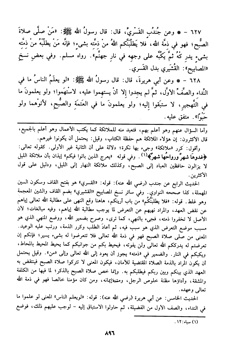 627 - وعن جندب القسري، قال: قال رسول الله صلى الله عليه وسلم: ((من صلي صلاة الصبح؛ فهو في ذمة الله، فلا يطلبنكم الله من ذمته بشيء، فإنه يطلبه من ذمته بشيء يدركه ثم يكبه علي وجهه في نار جهنم)). رواه مسلم. وفي بعض نسخ ((المصابيح)): القشيري بدل القسري.
