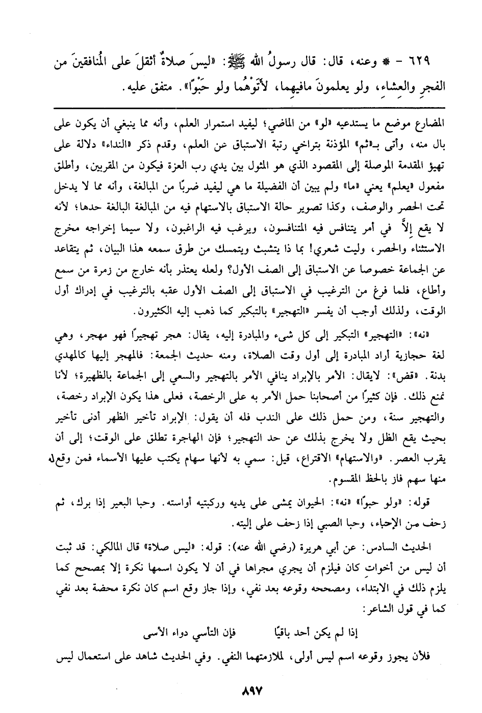 629 - وعنه، قال: قال رسول الله صلى الله عليه وسلم: ((ليس صلاة أثقل علي المنافقين من الفجر والعشاء، ولو يعلمون ما فيهما، لأتوهما ولو حبوا)). متفق عليه.