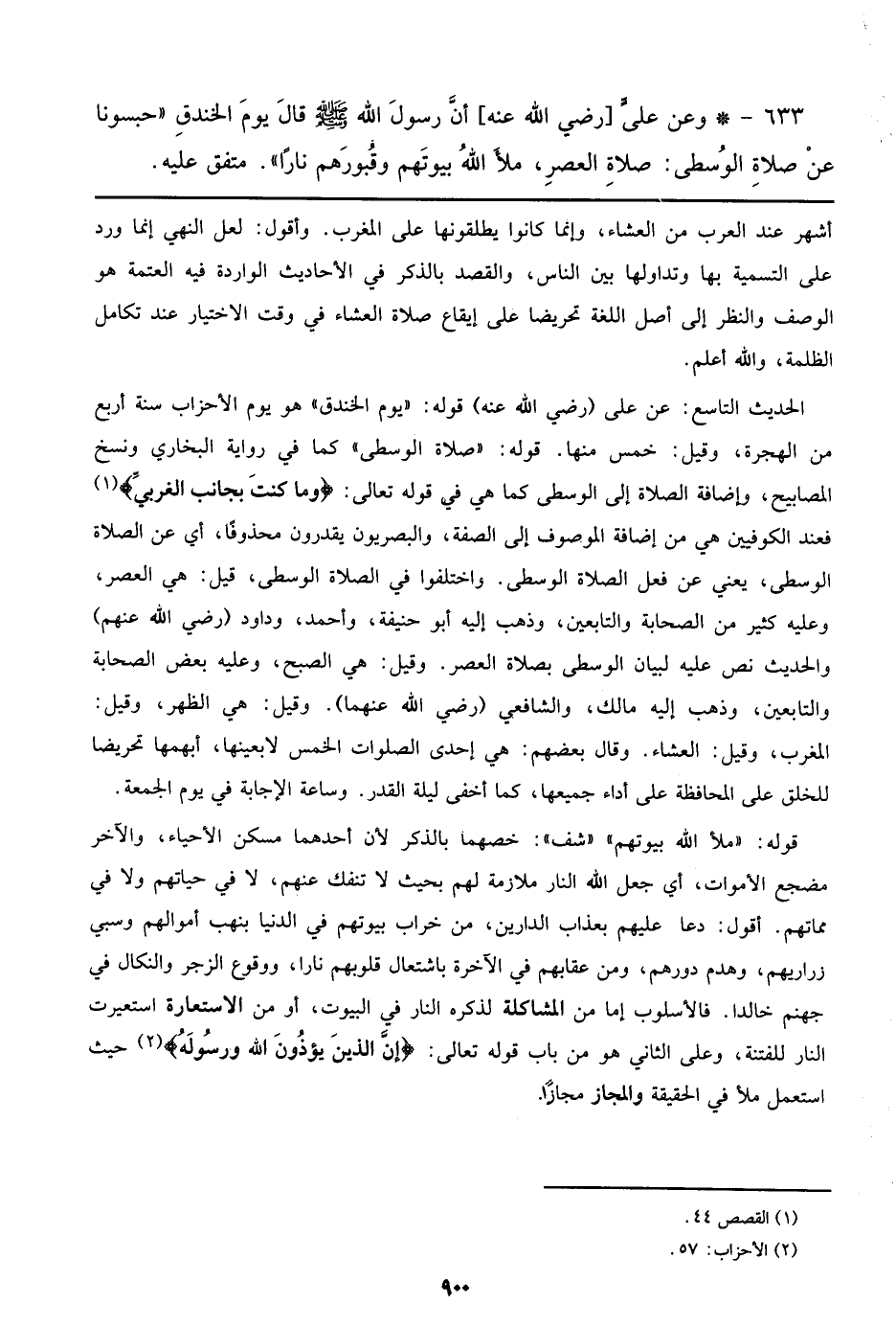 633 - وعن علي [رضي الله عنه] أن رسول الله صلى الله عليه وسلم قال يوم الخندق ((حبسونا عن صلاة الوسطى: صلاة العصر، ملأ الله بيوتهم وقبورهم ناراً)). متفق عليه.