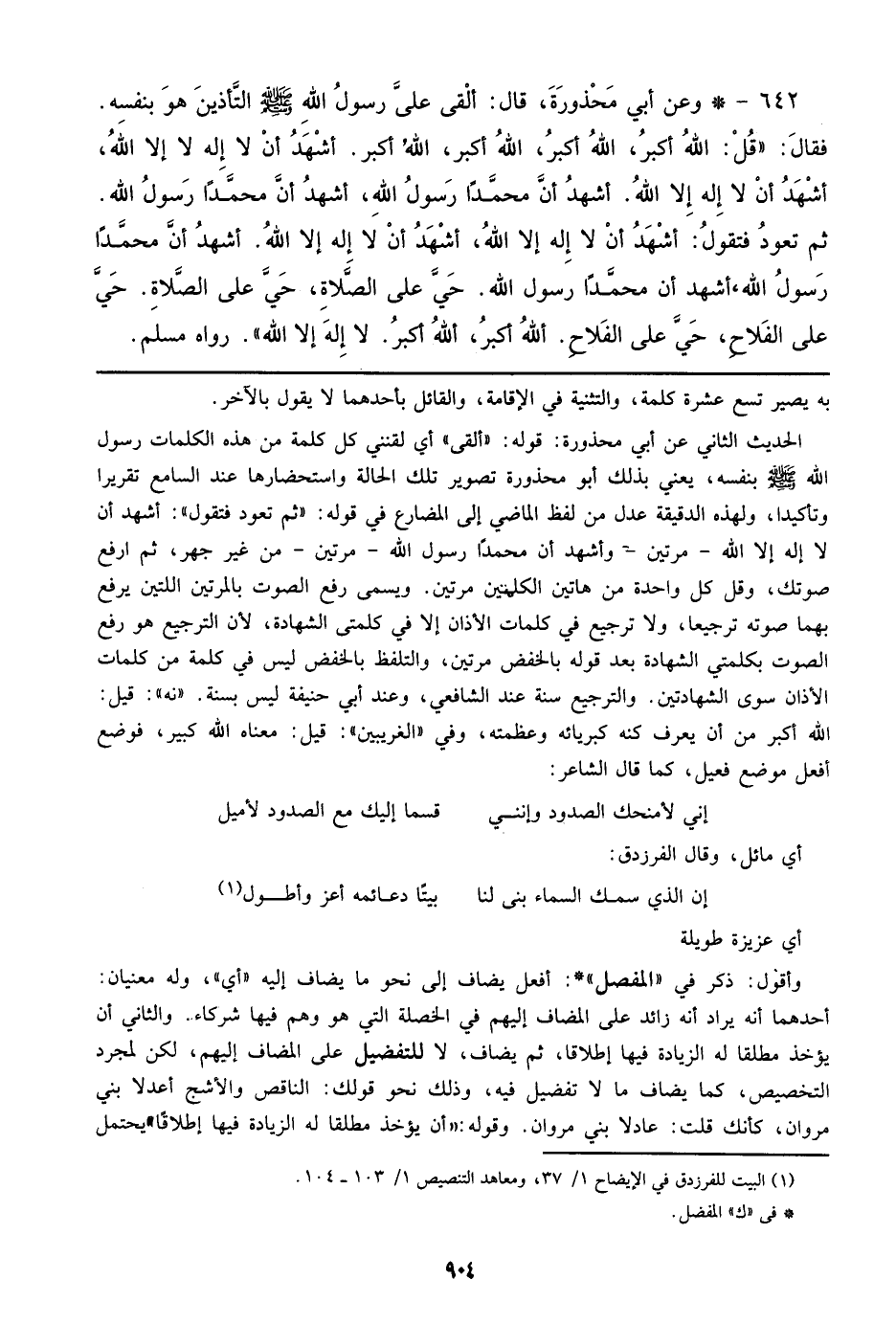 642 - وعن أبي محذورة، قال: ألقى علي رسول الله صلى الله عليه وسلم التأذين هو بنفسه. فقال: ((قل: الله أكبر، الله أكبر، الله أكبر، الله أكبر. أشهد أن لا إله إلا الله، أشهد أن لا إله إلا الله. أشهد أن محمداً رسول الله، أشهد أن محمداً رسول الله. ثم تعود فتقول: أشهد أن لا إله إلا الله، أشهد أن لا إله إلا الله. أشهد أن محمداً رسول الله، أشهد أن محمداً رسول الله. حي علي الصلاة، حي علي الصلاة. حي علي الفلاح، حي علي الفلاح. الله أكبر، الله أكبر. لا إله إلا الله)). رواه مسلم.