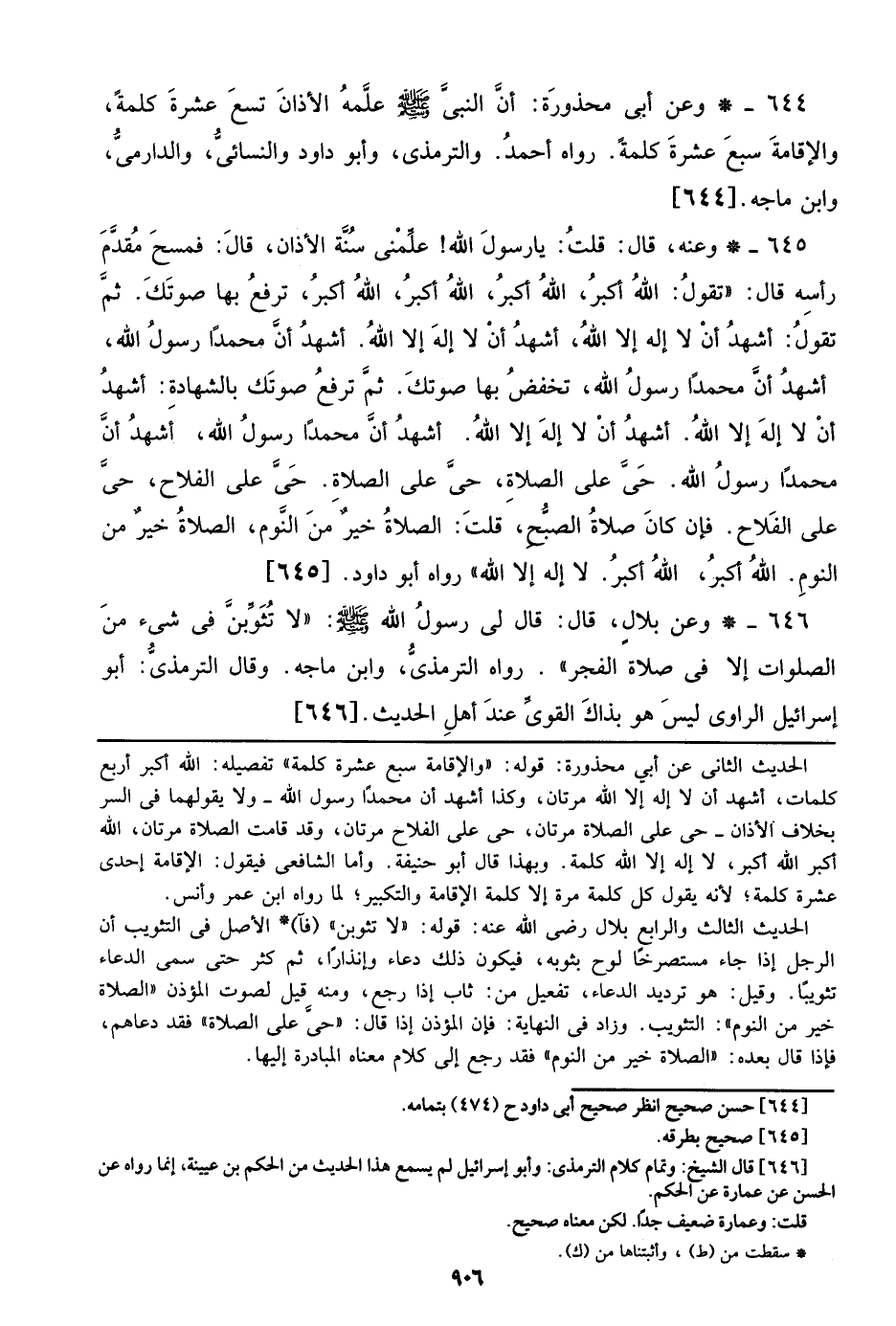 644 - وعن أبي محذورة: أن النبي صلى الله عليه وسلم علمه الأذان تسع عشرة كلمة، والإقامة سبع عشرة كلمة. رواه أحمد. والترمذي، وأبو داود والنسائي، والدارمي، وابن ماجه. [644]