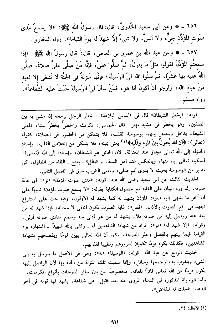 657 - وعن عبد الله بن عمرو بن العاص، قال: قال رسول الله صلى الله عليه وسلم: ((إذا سمعتم المؤذن فقولوا مثل ما يقول، ثم صلوا علي؛ فإنه من صلي علي صلاة، صلي الله عليه بها عشراً، ثم سلوا الله لي الوسيلة؛ فإنها منزلة في الجنة لا تنبغي إلا لعبد من عباد اله، وأرجو أن أكون أنا هو، فمن سأل لي الوسيلة حلت عليه الشفاعة)). رواه مسلم.