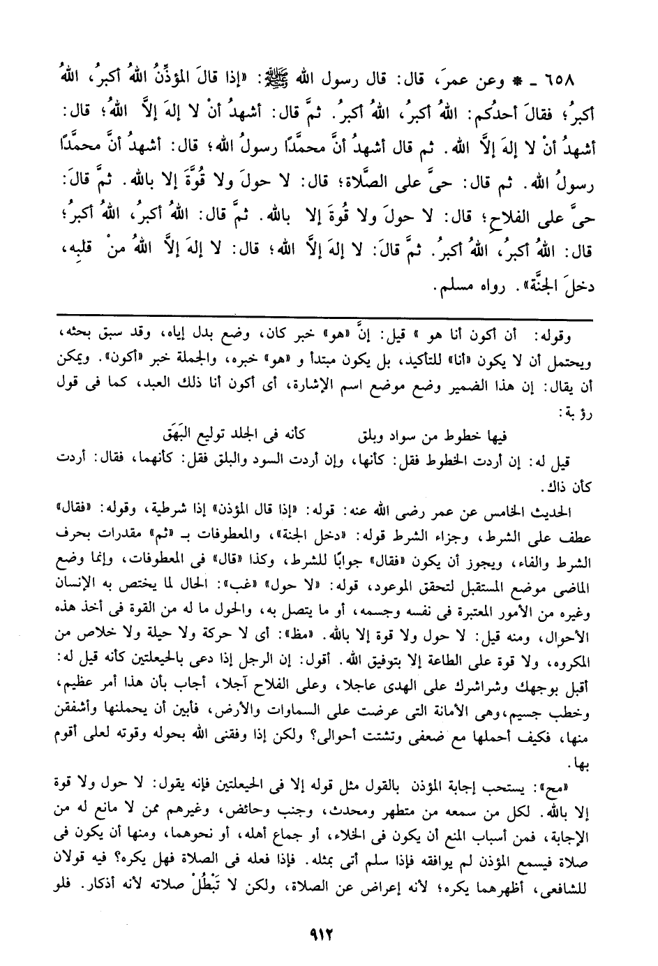 الحديث الخامس عن عمر رضي الله عنه: قوله: ((إذا قال المؤذن)) إذا شرطية، وقوله: ((فقال)) عطف علي الشرط، وجزاء الشرط قوله: ((دخل الجنة))، والمعطوفات بـ ((ثم)) مقدرات بحرف الشرط والفاء، ويجوز أن يكون ((فقال)) جواباً للشرط، وكذا ((قال)) في المعطوفات، وإنما وضع الماضي موضع المستقبل لتحقيق الموعود، قوله: ((لا حول)) ((غب)): الحال لما يختص به الإنسان وغيره من الأمور المعتبرة في نفسه وجسمه، أو ما يتصل به، والحول ما له من القوة في أخذ هذه الأحوال، ومنه قيل: لا حول ولا قوة إلا بالله. ((مظ)): أي لا حركة ولا حيلة ولا خلاص من المكروه، ولا قوة علي الطاعة إلا بتوفيق الله. أقول: إن الرجل إذا دعى بالحيعلتين كأنه قيل له: أقبل بوجهك وشراشرك علي الهدى عاجلاً، وعلي الفلاح آجلاً، أجاب بأن هذا أمر عظيم، وخطب جسيم، وهي الأمانة التي عرضت علي السماوات والأرض، فأبين أن يحملنها وأشفقن منها، فكيف أحملها مع ضعفي وتشتت أحوالي؟ ولكن إذا وفقني الله بحوله وقوته لعلي أقوم بها.