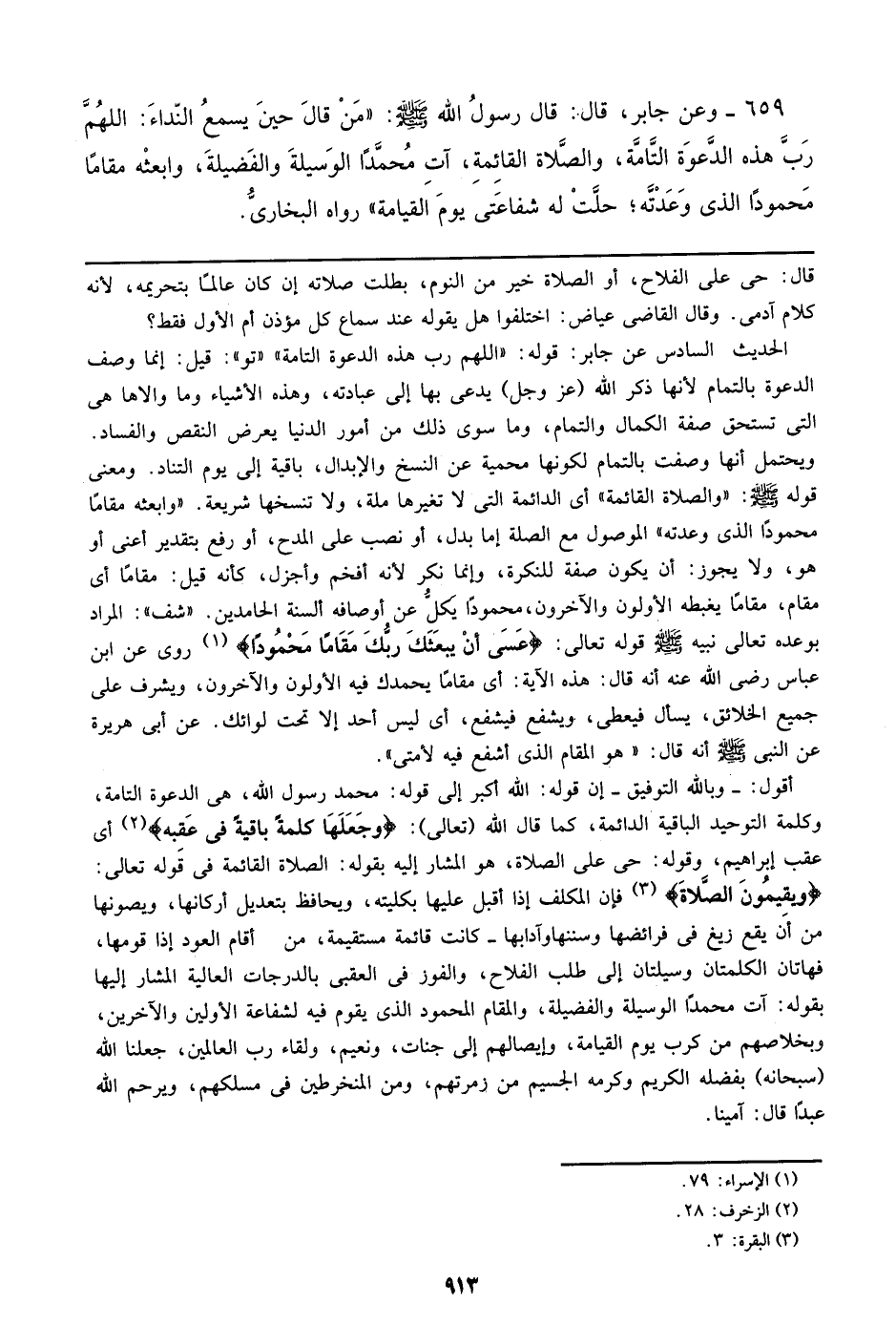 659 - وعن جابر، قال: قال رسول الله صلى الله عليه وسلم: ((من قال حين يسمع النداء: اللهم رب هذه الدعوة التامة، والصلاة القائمة، آت محمداً الوسيلة والفضيلة، وابعثه مقاماً محموداً الذي وعدته؛ حلت له شفاعتي يوم القيامة)) رواه البخاري.
