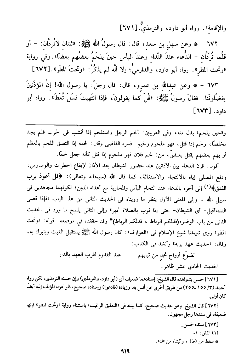 أقول: قرن الدعاء بين الأذإنين عند حضور الشيطان بعد الأذان لإيقاع الخطرات والوساوس، ودفع المصلي إياه بالالتجاء والاستغاثة، كما قال الله (سبحانه وتعالي): {قل أعوذ برب الفلق} إلي آخره بالدعاء عند التحام البأس والمحاربة مع أعداء الدين؛ لكونهما مجاهدين في سبيل الله، وإلي المعنى الأول ينظر ما رويناه في الحديث الثاني من هذا الباب ((فإذا قضي النداء أقبل- أي الشيطان- حتى إذا ثوب بالصالة أدبر)) وإلي الثاني يلمح ما ورد في الحديث الثاني من باب الوضوء (فذلكم الرباط، فذلكم الرباط) وقد حققناه في موضعه. قوله: ((وتحت المطر)) روى شيخنا شيخ الإسلام في ((العوارف)): كان رسول الله صلى الله عليه وسلم يستقبل الغيث ويتبرك به، وقال: ((حديث عهد بربه)) وأنشد في الكتاب: