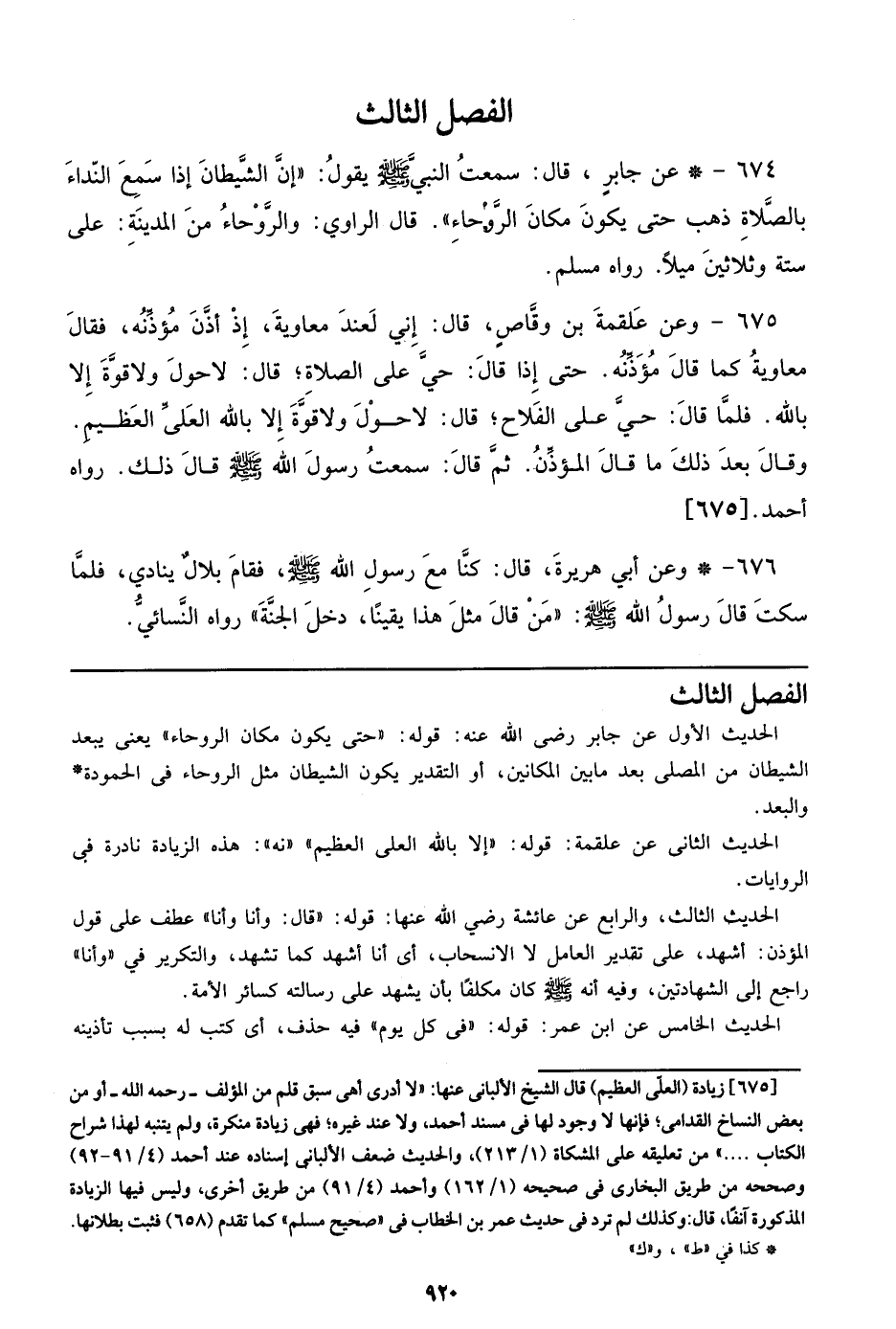 674 - عن جابر، قال: سمعت النبي صلى الله عليه وسلم يقول: ((إن الشيطان إذا سمع النداء بالصلاة ذهب حتى يكون مكان الروحاء)). قال الراوي: والروحاء من المدينة: علي ستة وثلاثين ميلاً رواه مسلم.