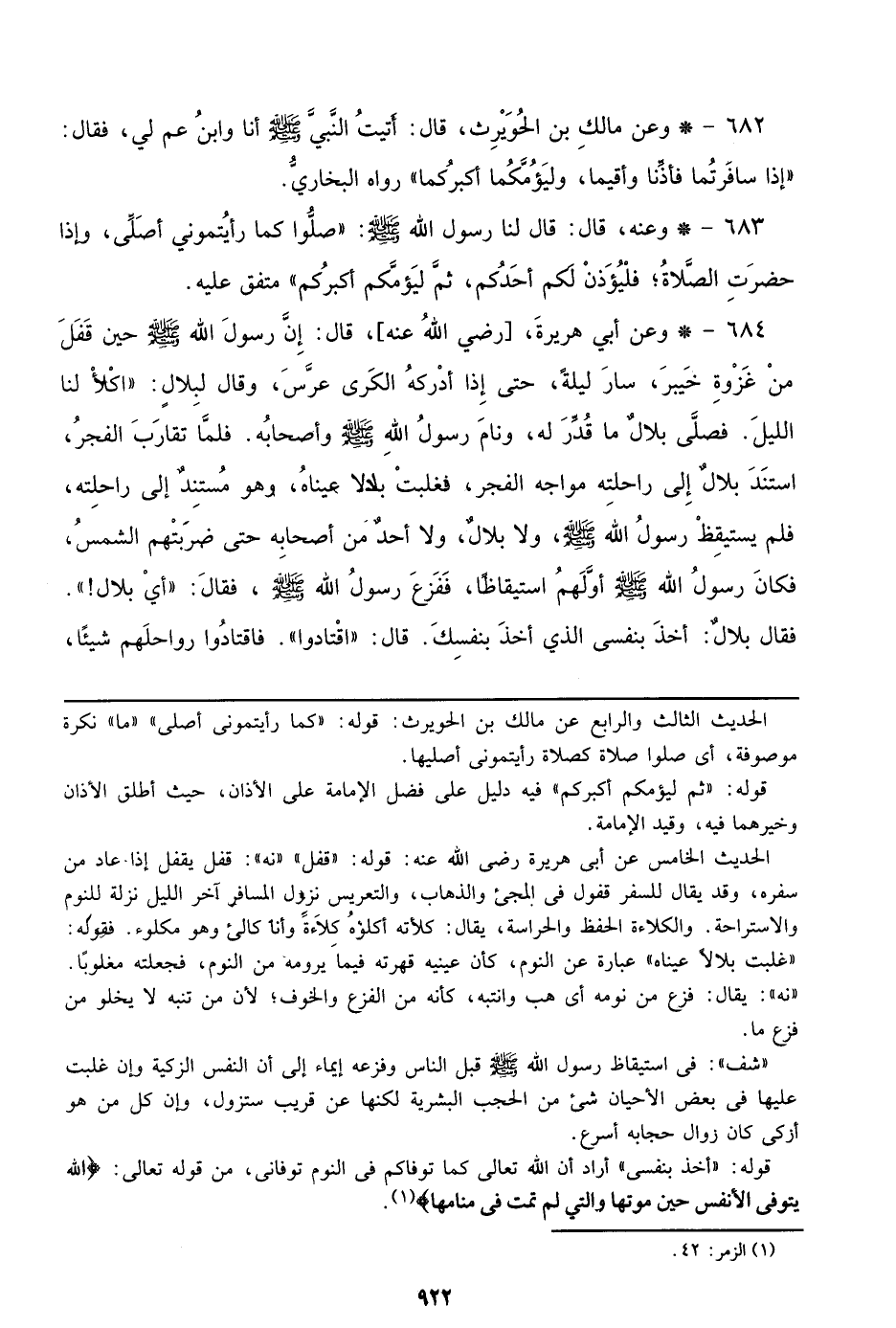 الحديث الخامس عن أبي هريرة رضي الله عنه: قوله: ((قفل)) ((نه)): قفل يقفل إذا عاد من سفره، وقد يقال للسفر قفول في المجيء والذهاب، والتعريس نزول المسافر آخر الليل نزلة للنوم والاستراحة. والكلاءة الحفظ والحراسة، يقال: كلأته أكلوه كلاءة وأنا كالئ وهو مكلوء. فقوله: ((غلبت بلالاً عيناه)) عبارة عن النوم، كأن عينيه قهرته فيما يرومه من النوم، فجعلته مغلوباً. ((نه)): يقال: فزع من نومه أي هب وانتبه، كأنه من الفزع والخوف؛ لأن من تنبه لا يخلو من فزع ما.
