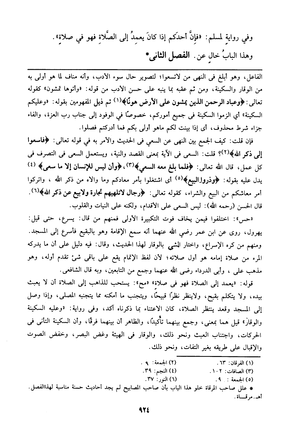 الفاعل، وهو أبلغ في النهي من لا تسعوا؛ لتصوير حال سوء الأدب، وأنه مناف لما هو أولي به من الوقار والسكينة، ومن ثم عقبه بما ينبه علي حسن الأدب من قوله: ((وأتوها تمشون)) كقوله تعالي: {وعباد الرحمن الذين يمشون علي الأرض هوناً} ثم ذيل المفهومين بقوله: ((وعليكم السكينة)) أي الزموا السكينة في جميع أموركم، خصوصاً في الوفود إلي جناب رب العزة، والفاء جزاء شرط محذوف، أي إذا بينت لكم ما هو أولي بكم فما أدركتم فصلوا.