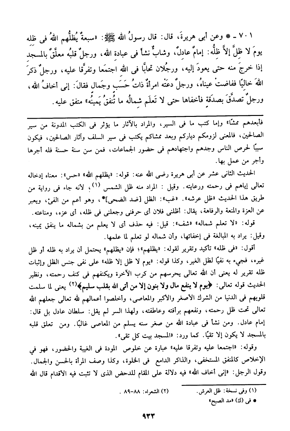 701 - وعن أبي هريرة، قال: قال رسول الله صلى الله عليه وسلم: ((سبعة يظلهم الله في ظله يوم لا ظل إلا ظله: إمام عادل، وشاب نشأ في عبادة الله، ورجل قلبه معلق بالمسجد إذا خرج منه حتى يعود إليه، ورجلان تحابا في الله اجتمعا وتفرقا عليه، ورجل ذكر الله خالياً ففاضت عيناه، ورجل دعته امرأة ذات حسب وجمال فقال: إني أخاف الله، ورجل تصدق بصدقة فأخفاها حتى لا تعلم شماله ما تنفق يمينه)) متفق عليه.