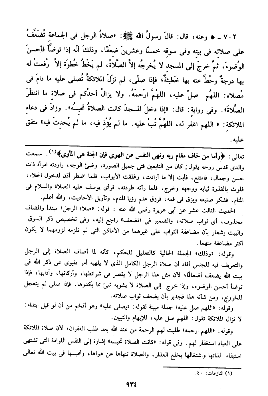 702 - وعنه، قال: قال رسول الله صلى الله عليه وسلم: ((صلاة الرجل في الجماعة تضعف علي صلاته في بيته وفي سوقه خمساً وعشرين ضعفاً، وذلك أنه إذا توضأ فأحسن الوضوء، ثم خرج إلي المسجد لا يخرجه إلا الصلاة، لم يخط خطوة إلا رفعت له بها درجة وحط عنه بها خطيئة؛ فإذا صلي، لم تزل الملائكة تصلي عليه ما دام في مصلاه: اللهم صل عليه، اللهم ارحمه. ولا يزال أحدكم في صلاة ما انتظر الصلاة)). وفي رواية: قال: ((إذا دخل المسجد كانت الصلاة تحبسه)). وزاد في دعاء الملائكة. ((اللهم اغفر له، اللهم تب عليه. ما لم يؤذ فيه، ما لم يحدث فيه)) متفق