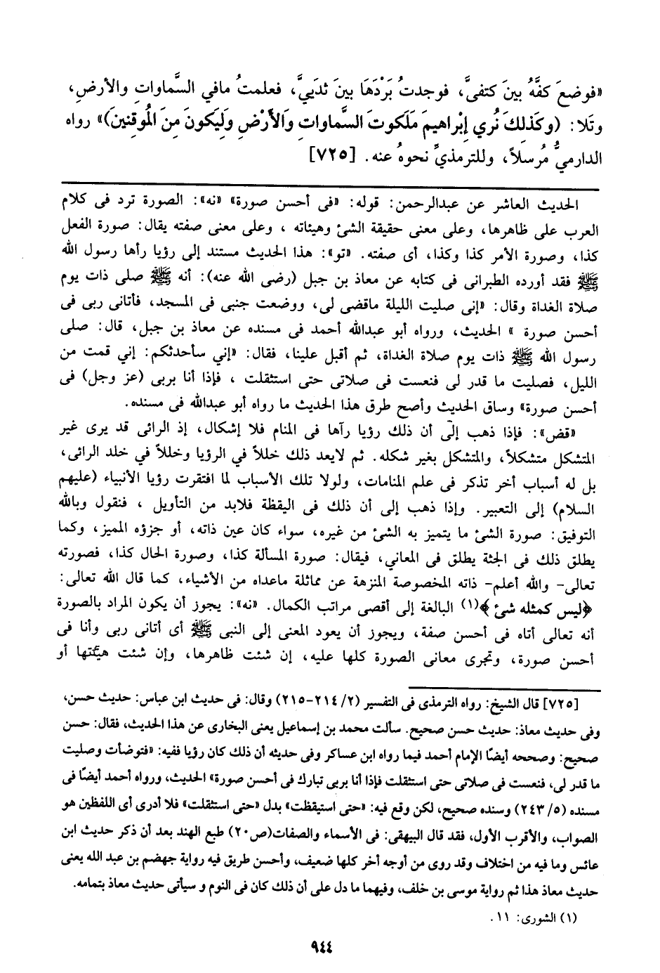 الحديث العاشر عن عبد الرحمن: قوله: ((في أحسن صورة)) ((نه)): الصورة ترد في كلام العرب علي ظاهرها، وعلي معنى حقيقة الشيء وهيئاته، وعلي معنى صفتيه يقال: صورة الفعل كذا، وصورة الأمر كذا وكذا، أي صفته. ((تو)): هذا الحديث مستند إلي رؤيا رأها رسول الله صلى الله عليه وسلم فقد أورده الطبرإني في كتابه عن معاذ بن جبل (رضي الله عنه): أنه صلى الله عليه وسلم صلي ذات يوم صلاة الغداة وقال: ((إني صليت الليلة ما قضى لي، ووضعت جنبي في المسجد، فأتإني ربي في أحسن صورة)) الحديث، ورواه أبو عبد الله أحمد في مسند عن معاذ بن جبل، قال: صلي رسول الله صلى الله عليه وسلم ذات يوم صلاة الغداة، ثم أقبل علينا، فقال: ((إني سأحدثكم: إني قمت من الليل، فصليت ما قدر لي فنعست في صلاتي حتى استثقلت، فإذا أنا بربي (عز وجل) في أحسن صورة)) وساق الحديث وأصح طرق هذا الحديث ما رواه أبو عبد الله في مسنده.