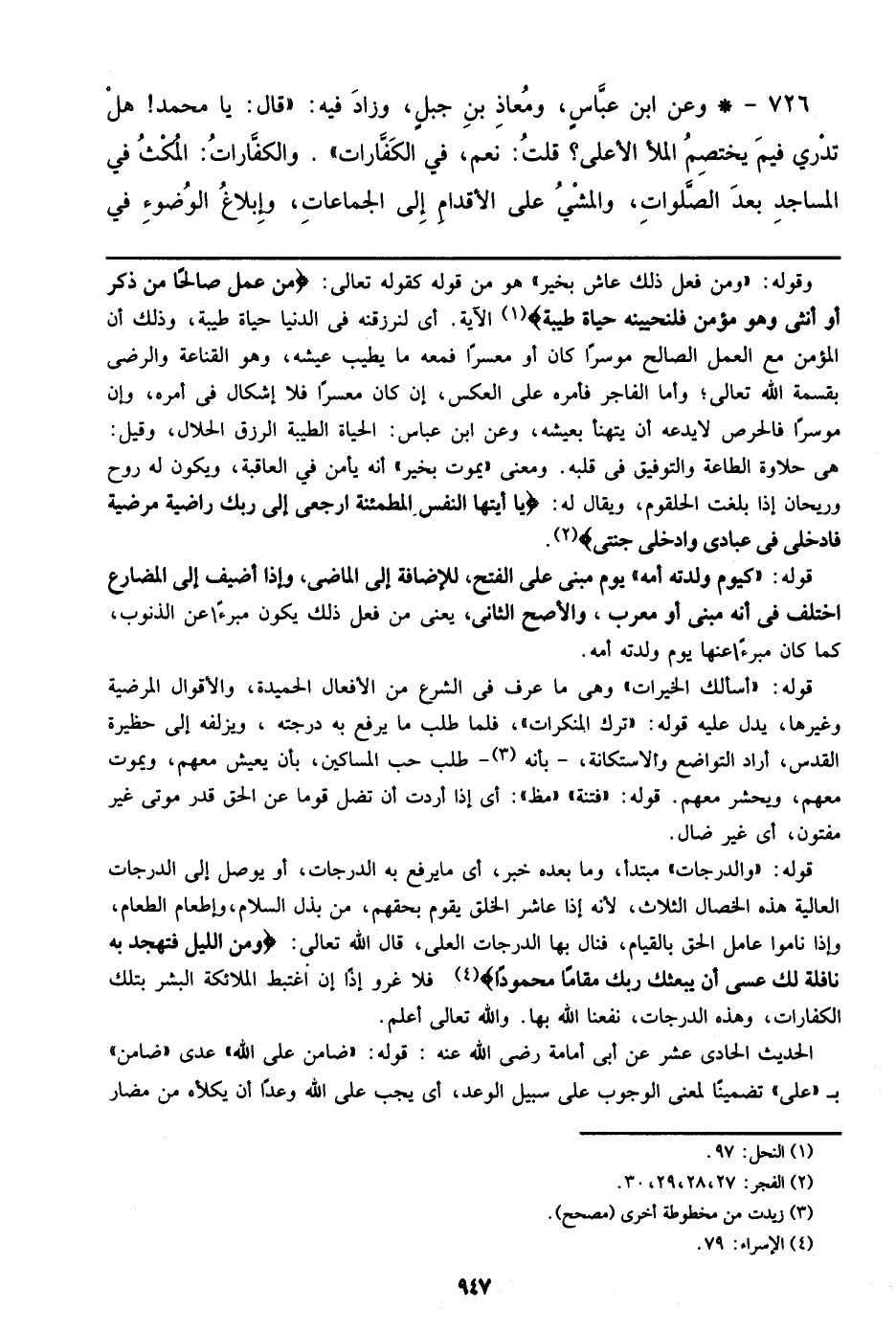 726 - وعن ابن عباس، ومعاذ بن جبل، وزاد فيه: ((قال: يا محمد! هل تدري فيم يختصم الملأ الأعلي؟ قلت: نعم، في الكفارات)). والكفارات: المكث في المساجد بعد الصلوات، والمشي علي الأقدام إلي الجماعات، وإبلاغ الوضوء في