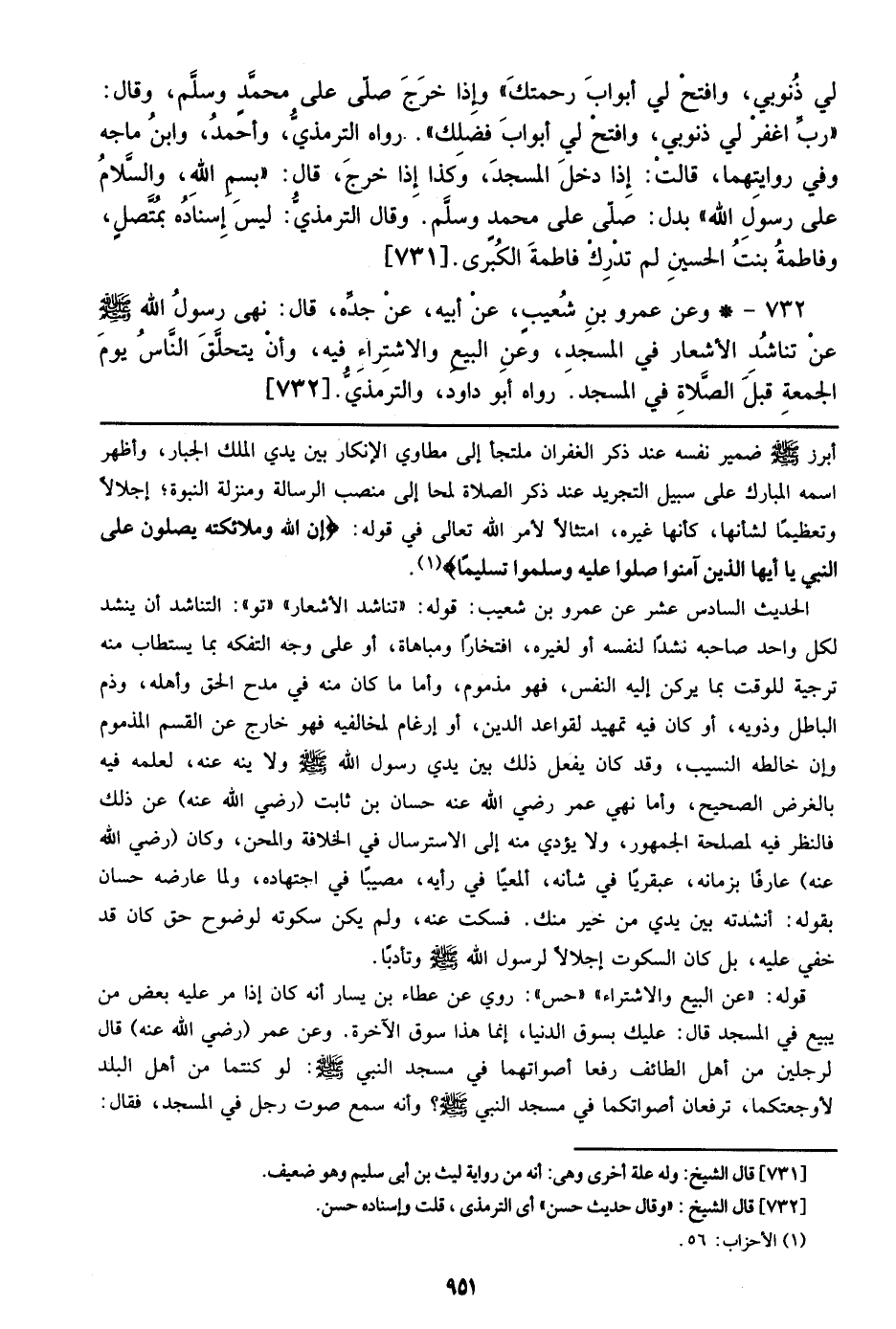 732 - وعن عمرو بن شعيب، عن أبيه، عن جده، قال: نهي رسول الله صلى الله عليه وسلم عن تناشد الأشعار في المسجد، وعن البيع والاشتراء فيه، وأن يتحلق الناس يوم الجمعة قبل الصلاة في المسجد. رواه أبو داود، والترمذي. [732]