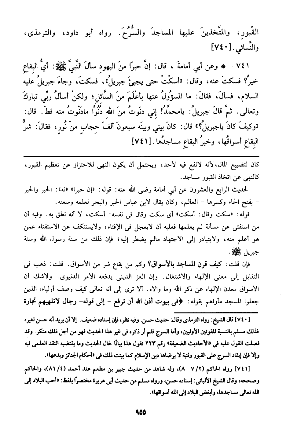 741 - وعن أبي أمامة، قال: إن حبراً من اليهود سأل النبي صلى الله عليه وسلم: أي البقاع خير؟ فسكت عنه، وقال: ((أسكت حتى يجيء جبريل))، فسكت، وجاء جبريل عليه السلام، فسأل، فقال: ما المسؤول عنها بأعلم من السائل؛ ولكن أسأل ربي تبارك وتعالي. ثم قال جبريل: يا محمدا! إني دنوت من الله دنواً ما دنوت منه قط. قال: ((وكيف كان يا جبريل؟)) قال: بيني وبينه سبعون ألف حجاب من نور، فقال: شر البقاع أسواقها، وخير البقاع مساجدها. [741]