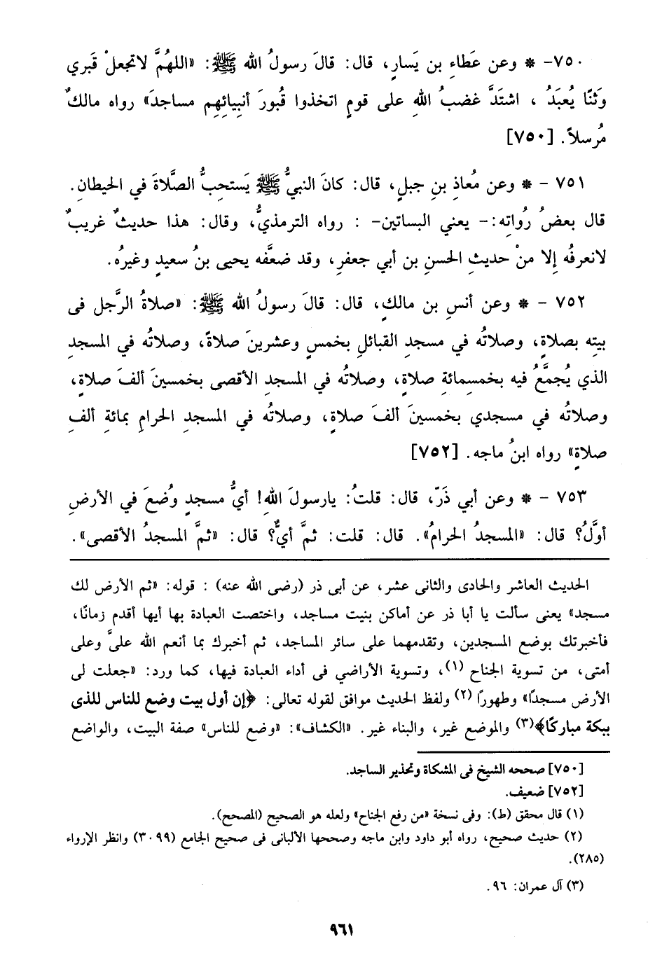 751 - وعن معاذ بن جبل، قال: كان النبي صلى الله عليه وسلم يستحب الصلاة في الحيطان. قال بعض رواته:- يعني البساتين-: رواه الترمذي، وقال: هذا حديث غريب لا نعرفه إلا من حديث الحسن بن أبي جعفر، وقد ضعفه يحيى بن سعيد وغيره.