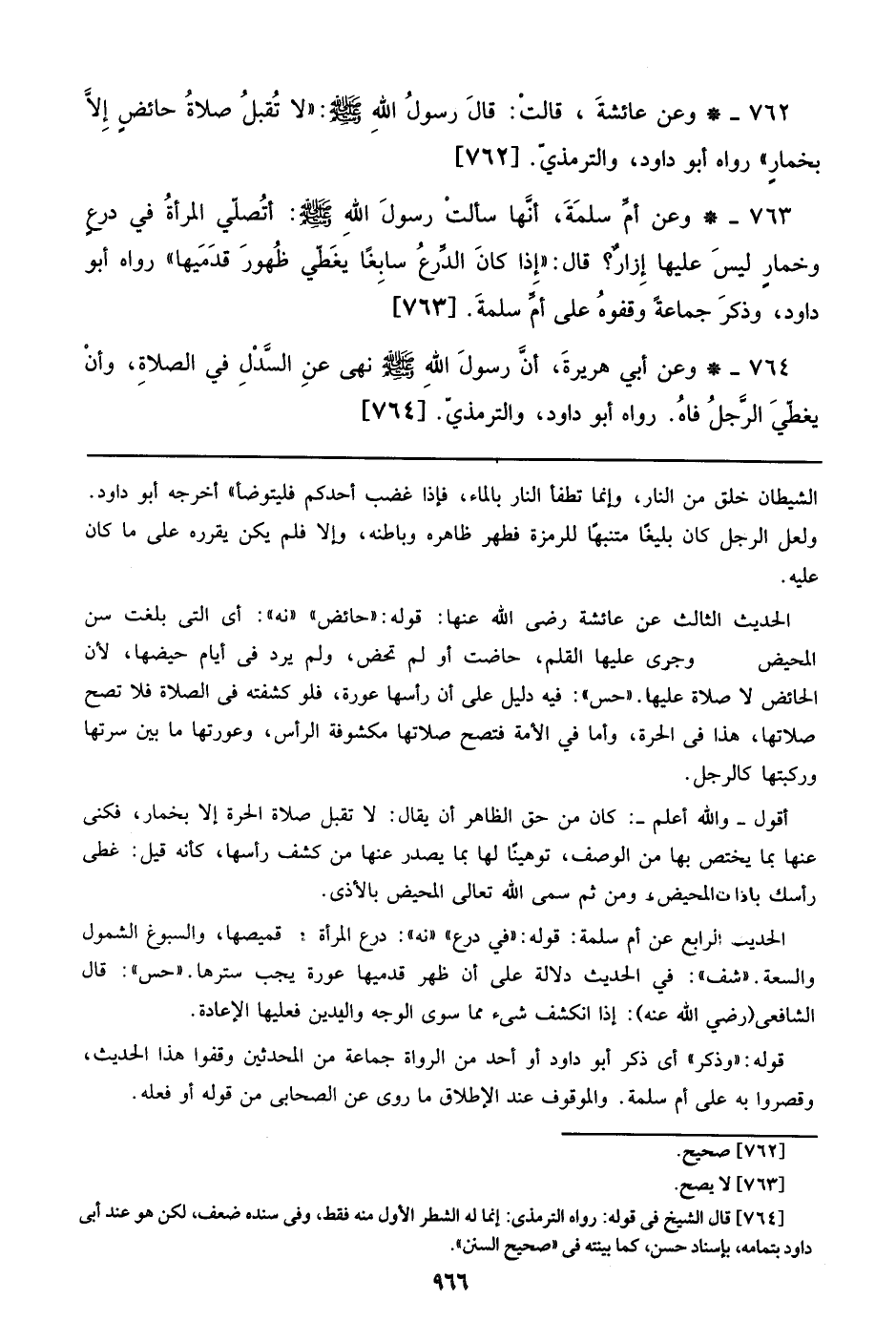 762 - وعن عائشة، قالت: قال رسول الله صلى الله عليه وسلم: ((لا تقبل صلاة حائض إلا بخمار)) رواه أبو داود، والترمذي. [762]