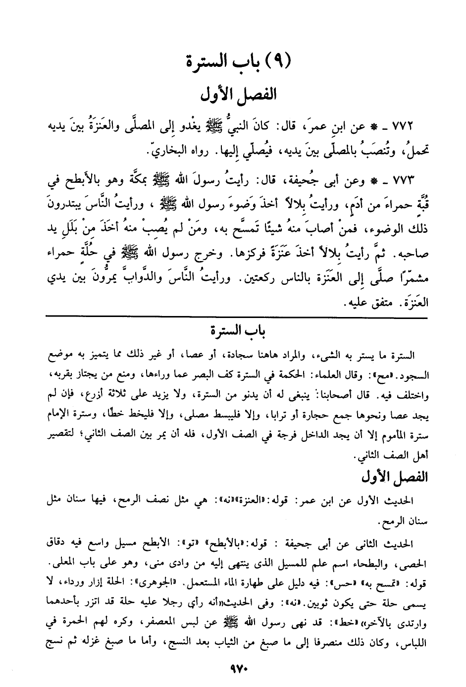772 - عن ابن عمر، قال: كان النبي صلى الله عليه وسلم يغدو إلي المصلي والعنزة بين يديه تحمل، وتنصب بالمصلي بين يديه، فيصلي إليها. رواه البخاري.