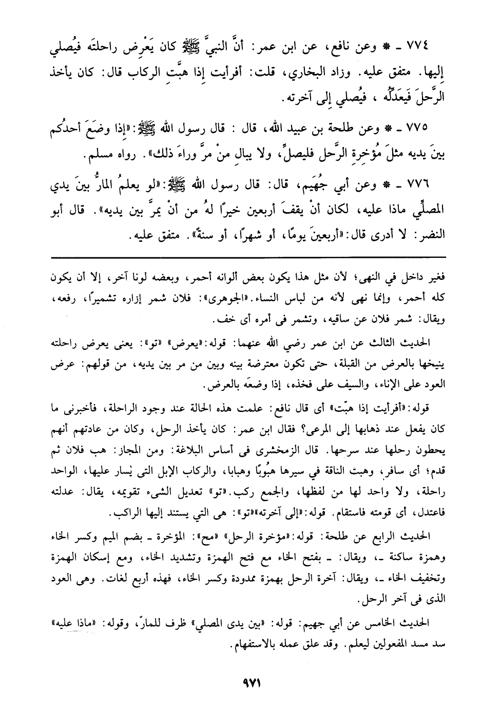 774 - وعن نافع، عن ابن عمر: أن النبي صلى الله عليه وسلم كان يعرض راحلته فيصلي إليها. متفق عليه. وزاد البخاري، قلت: أفرأيت إذا هبت الركاب قال: كان يأخذ الرحل فيعدله، فيصلي إلي آخرته.