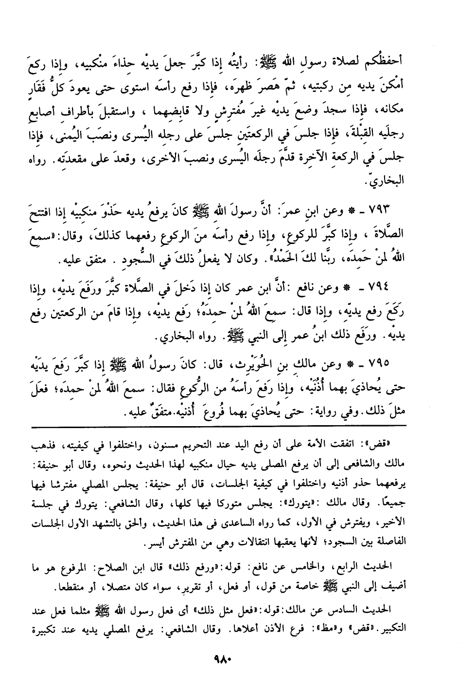 794 - وعن نافع: أن ابن عمر كان إذا دخل في الصلاة كبر ورفع يديه، وإذا ركع رفع يديه، وإذا قال: سمع الله لمن حمده؛ رفع يديه، وإذا قام من الركعتين رفع يديه. ورفع ذلك ابن عمر إلي النبي صلى الله عليه وسلم رواه البخاري.