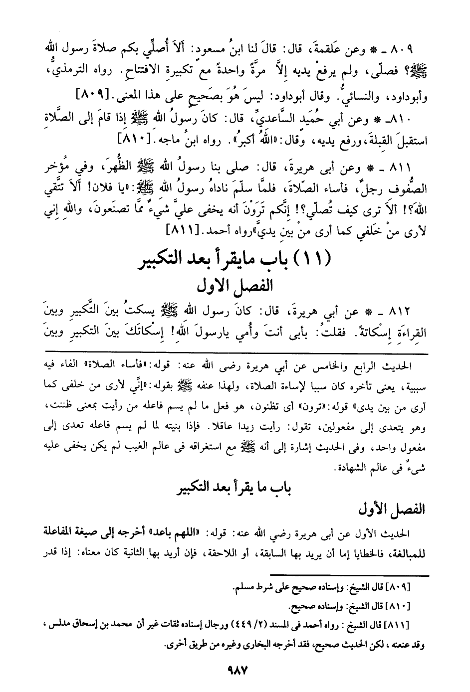 812 - عن أبي هريرة، قال: كان رسول الله صلى الله عليه وسلم يسكت بين التكبير وبين القراءة إسكاتة. فقلت: بأبي أنت وأمي يا رسول الله! إسكاتك بين التكبير وبين