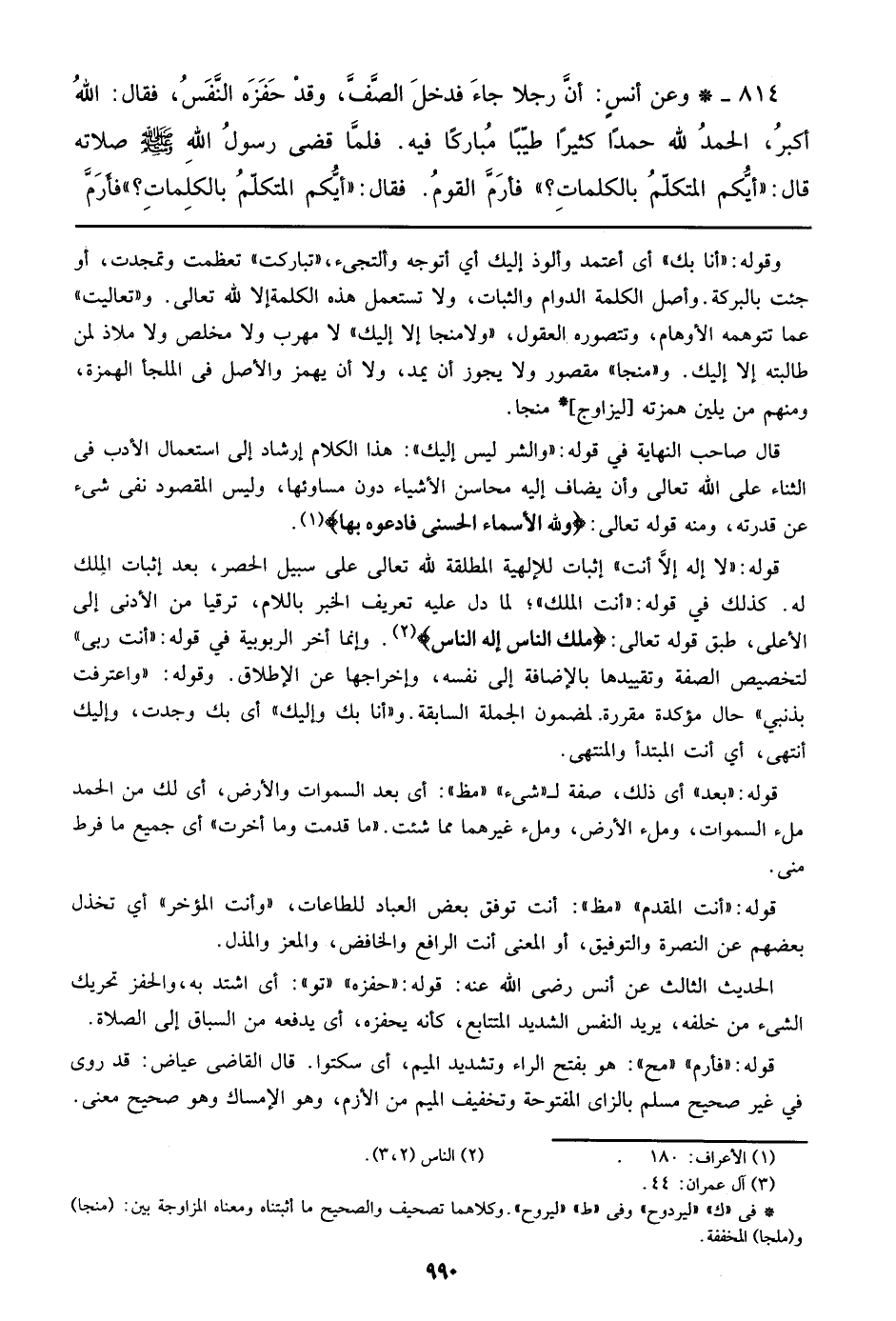 وقوله: ((أنا بك)) أي أعتمد وألوذ إليك أي أتوجه وألتجئ، ((تباركت)) تعاظمت وتمجدت، أو جئت بالبركة. وأصل الكلمة الدوام والثبات، ولا تستعمل هذه الكلمة إلا لله تعالي. و ((تعاليت)) عما تتوهمه الأوهام، وتتصوره العقول، ((ولا منجا إلا إليك)) لا مهرب ولا مخلص ولا ملاذ لمن طالبته إلا إليك. و ((منجا)) مقصور ولا يجوز أن يمد، ولا أن يهمز والأصل في الملجأ الهمزة، ومنهم من يلين همزته [ليزاوج] منجا.