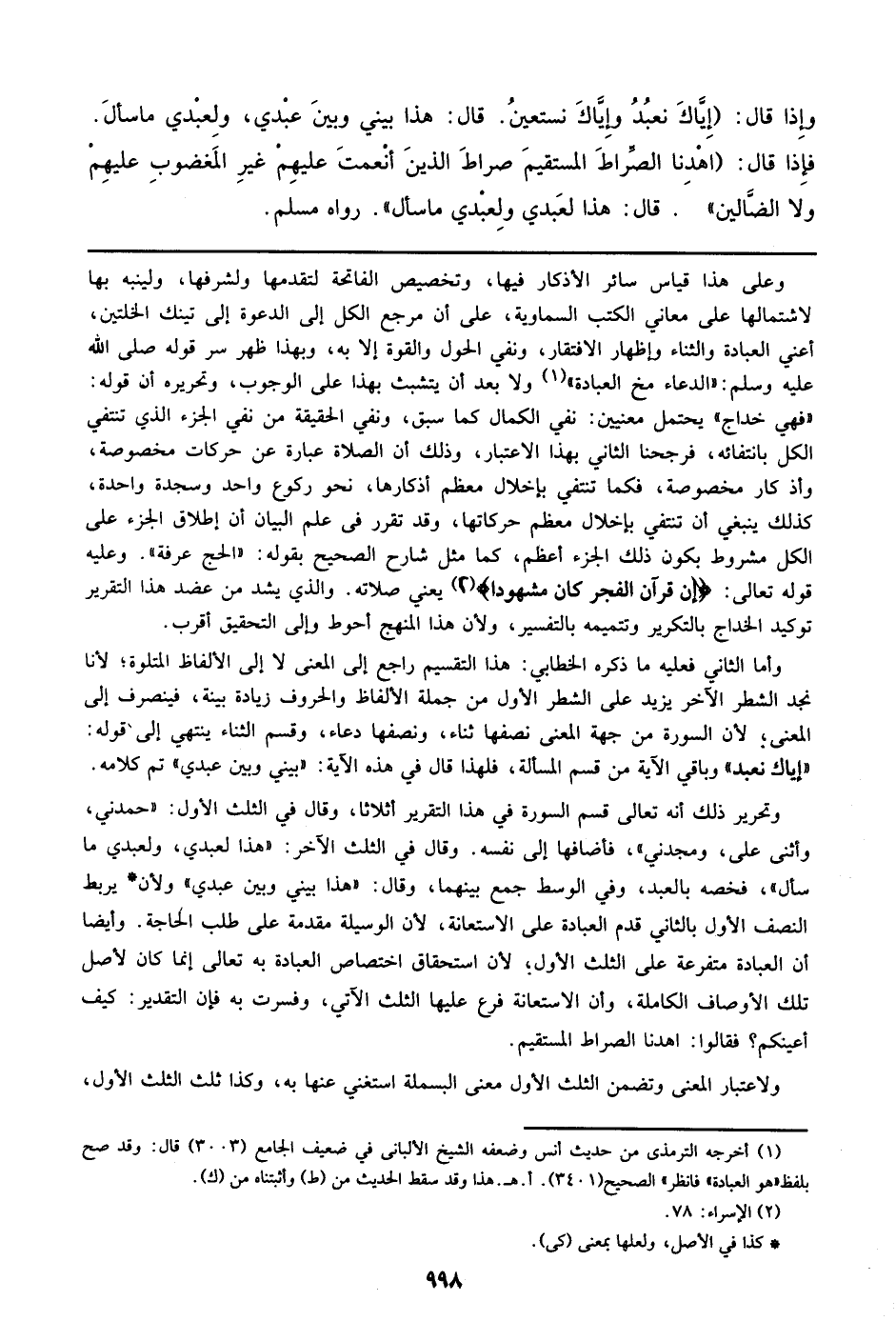 وتحرير ذلك أنه تعالي قسم السورة في هذا التقرير أثلاثا، وقال في الثلث الأول: ((حمدني، وأثنى علي، ومجدني))، فأضافها إلي نفسه. وقال في الثلث الآخر: ((هذا لعبدي، ولعبدي ما سأل))، فخصه بالعبد، وفي الوسط جمع بينهما، وقال: ((هذا بيني وبين عبدي)) ولأن يربط النصف الأول بالثاني قدم العبادة علي الاستعانة، لأن الوسيلة مقدمة علي طلب الحاجة. وأيضاً أن العبادة متفرعة علي الثلث الأول، لأن استحقاق اختصاص العبادة به تعالي إنما كان لأصل تلك الأوصاف الكاملة، وأن الاستعانة فرع عليها الثلث الآتي، وفسرت به فإن التقدير: كيف أعنيكم؟ فقالوا: اهدنا الصراط المستقيم.