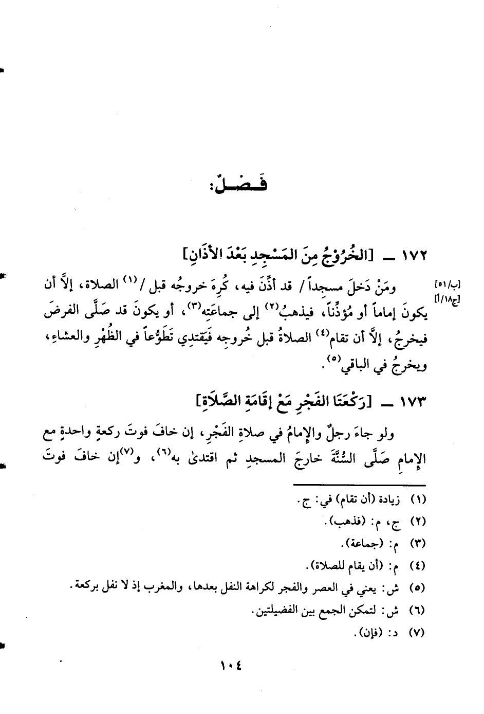 172 - الْخُرُوج من الْمَسْجِد بعد الْأَذَان وَمن دخل مَسْجِدا قد أذن فِيهِ كره خُرُوجه قبل الصَّلَاة إِلَّا أَن يكون إِمَامًا أَو مُؤذنًا فَيذْهب إِلَى جماعته أَو يكون قد صلى الْفَرْض فَيخرج إِلَّا أَن تُقَام الصَّلَاة قبل خُرُوجه فيقتدي تَطَوّعا فِي الظّهْر وَالْعشَاء وَيخرج فِي الْبَاقِي