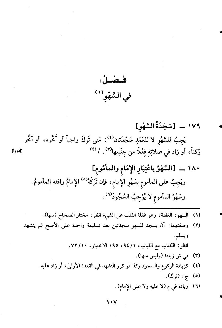 180 - السَّهْو بِاعْتِبَار الإِمَام وَالْمَأْمُوم وَيجب على الْمَأْمُوم بسهو الإِمَام فَإِن تَركه الإِمَام وَافقه الْمَأْمُوم وسهو الْمَأْمُوم لَا يُوجب السُّجُود