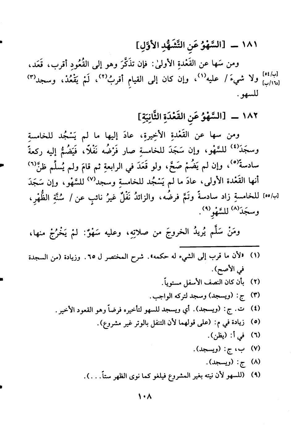 182 - السَّهْو عَن الْقعدَة الثَّانِيَة وَمن سَهَا عَن الْقعدَة الْأَخِيرَة عَاد إِلَيْهَا مَا لم يسْجد للخامسة وَسجد للسَّهْو وَإِن سجد للخامسة صَار فَرْضه نفلا فيضم إِلَيْهِ رَكْعَة سادسةً وَإِن لم يضم صَحَّ وَلَو قعد فِي الرَّابِعَة ثمَّ قَامَ وَلم يسلم ظن أَنَّهَا الْقعدَة الأولى عَاد مَا لم يسْجد للخامسة وَسجد للسَّهْو وَإِن سجد للخامسة زَاد سادسةً وَتمّ فَرْضه وَالزَّائِد نفل غير نَائِب عَن سنة الظّهْر وَسجد للسَّهْو وَمن سلم يُرِيد الْخُرُوج من صلَاته وَعَلِيهِ سَهْو لم يخرج مِنْهَا