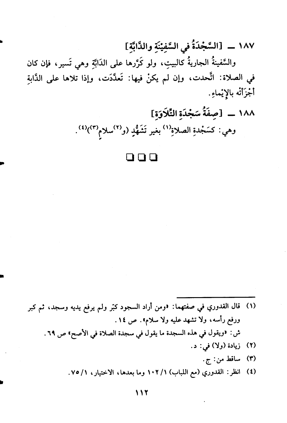 187 - السَّجْدَة فِي السَّفِينَة وَالدَّابَّة والسفينة الْجَارِيَة كالبيت وَلَو كررها على الدَّابَّة وَهِي تسير فَإِن كَانَ فِي الصَّلَاة أتحدت وَإِن لم يكن فِيهَا تعدّدت وَإِذا تَلَاهَا على الدَّابَّة أَجْزَأته بِالْإِيمَاءِ