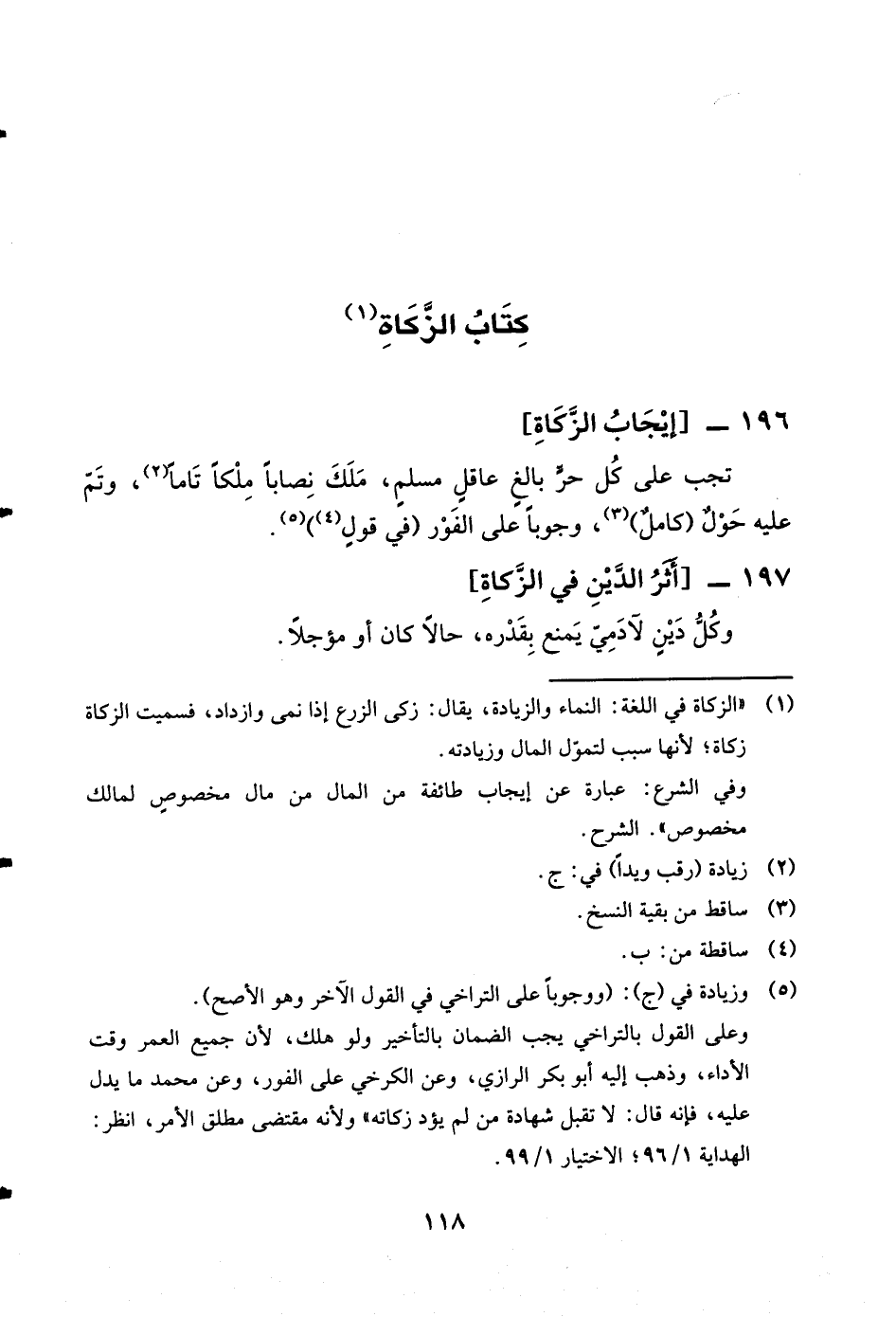 196 - إِيجَاب الزَّكَاة تجب على كل حر بَالغ عَاقل مُسلم ملك نِصَابا ملكا تَاما وَتمّ عَلَيْهِ حول كَامِل وجوبا على الْفَوْر فِي قَول