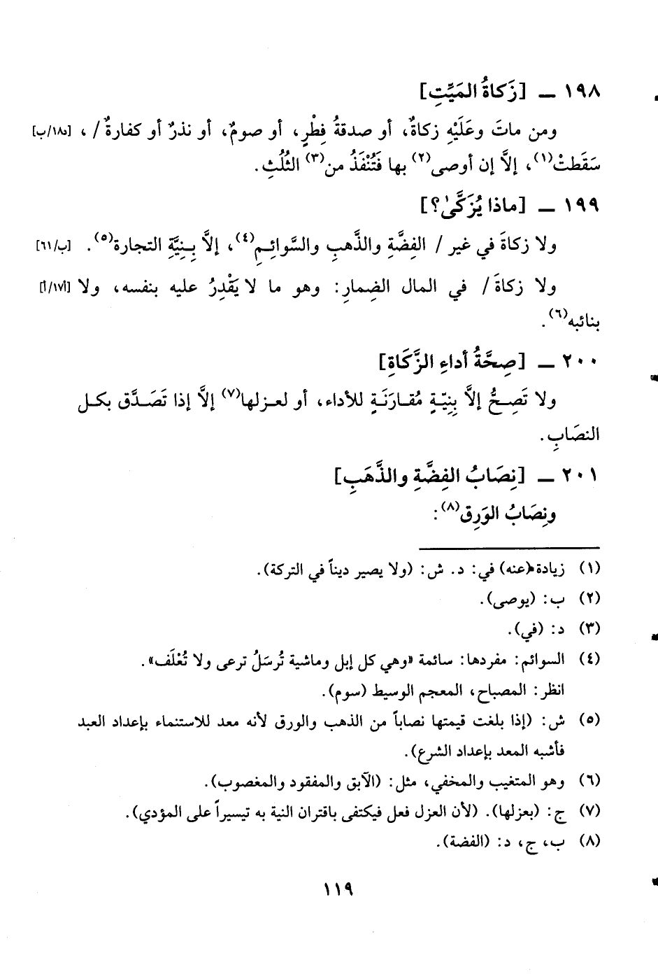 199 - مَاذَا يزكّى وَلَا زَكَاة فِي غير الْفضة وَالذَّهَب والسوائم إِلَّا بنية التِّجَارَة وَلَا زَكَاة فِي المَال الضمار وَهُوَ مَا لَا يقدر عَلَيْهِ بِنَفسِهِ وَلَا بنائبه