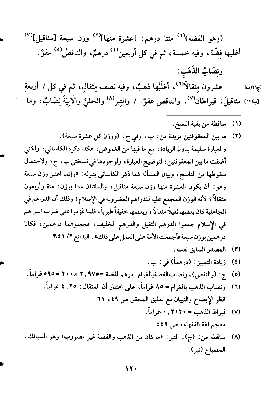 وَهُوَ الْفضة مئتا دِرْهَم عشرَة مِنْهَا وزن سَبْعَة مَثَاقِيل أغلبها فضَّة وَفِيه خَمْسَة ثمَّ فِي كل أَرْبَعِينَ دِرْهَم والناقص عَفْو ونصاب الذَّهَب عشرُون مِثْقَالا أغلبها ذهب وَفِيه نصف مِثْقَال ثمَّ فِي كل أَرْبَعَة مَثَاقِيل قيراطان والناقص عَفْو والتبر والحلي والآنية نِصَاب وَمَا