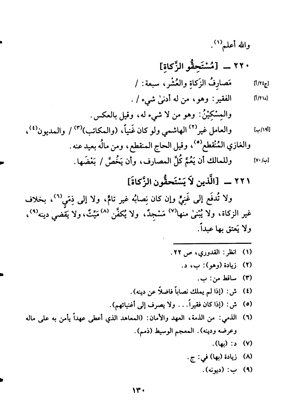 220 - مستحقو الزَّكَاة مصارف الزَّكَاة وَالْعشر سَبْعَة الْفَقِير وَهُوَ من لَهُ أدنى شَيْء والمسكين وَهُوَ من لَا شَيْء لَهُ وَقيل بِالْعَكْسِ وَالْعَامِل غير الْهَاشِمِي وَلَو كَانَ غَنِيا وَالْمكَاتب والمديون والغازي الْمُنْقَطع وَقيل الْحَاج الْمُنْقَطع وَمن مَاله بعيد عَنهُ وللمالك أَن يعم كل المصارف وَأَن يخص بَعْضهَا